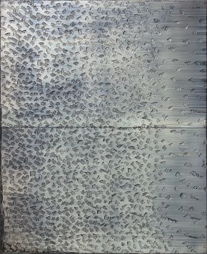 Антон работает на границе живописи и объекта, создавая полотна, приобретающие скульптурные качества за счет металлизированных красочных смесей. Текучая, отражающая и искажающая видимое, живопись Конюхова словно хочет выйти за собственные пределы, присвоить внешнее пространство, перекодировать отношения внутри него. В работах художника прочитывается обширный бэкграунд истории искусства двадцатого столетия. Геометризм скульптуры американского минимализма вступает в них в диалог с постминималистской идеей «антиформы», материи, отпущенной на волю, а также с играми фактурой итальянского arte povera.