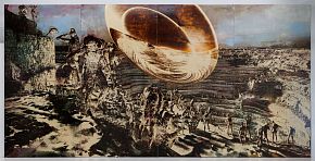 Художник также создает индустриальные пейзажи, трансформированные в футуристичные образы города, используя кузбасслак — каменноугольную смолу, что отсылает к промышленному контексту малой родины.