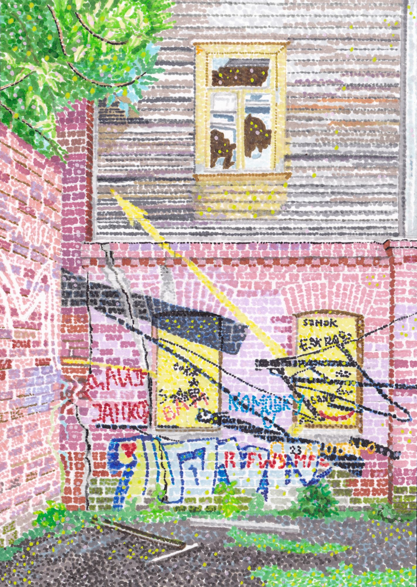 Люба Образцова переизобретает пуантилизм, раскладывая окружающий ее мир на атомы. Люба окончила художественное училище им. Рериха и успела поработать реставратором. Теоретическую базу Обрзацова добирала в Академии Художеств. С 2020 года входит в состав Новых городских художников. К наиболее ярким работам художницы относятся точечные серии графических листов. Серия «По дороге в диспансер» погружает в неспешную прогулку по обшарпанным дворам. В рамках издательского проекта AMINAZINE (который получил поддержку фонда Cosmoscow) был издан зин с «прогулкой», который теперь можно встретить во многих музейных библиотеках – от Гаража до Центра Помпиду. Еще одна серия, посвященная непарадному Нижнему Новгороду, появилась в 2025 году по итогам участия художницы в программе нижегородских арт-резиденций. Часть работ была представлена на Cosmoscow и полностью распродана в день превью. Также эти работы успели засветиться в галерее Пальто.