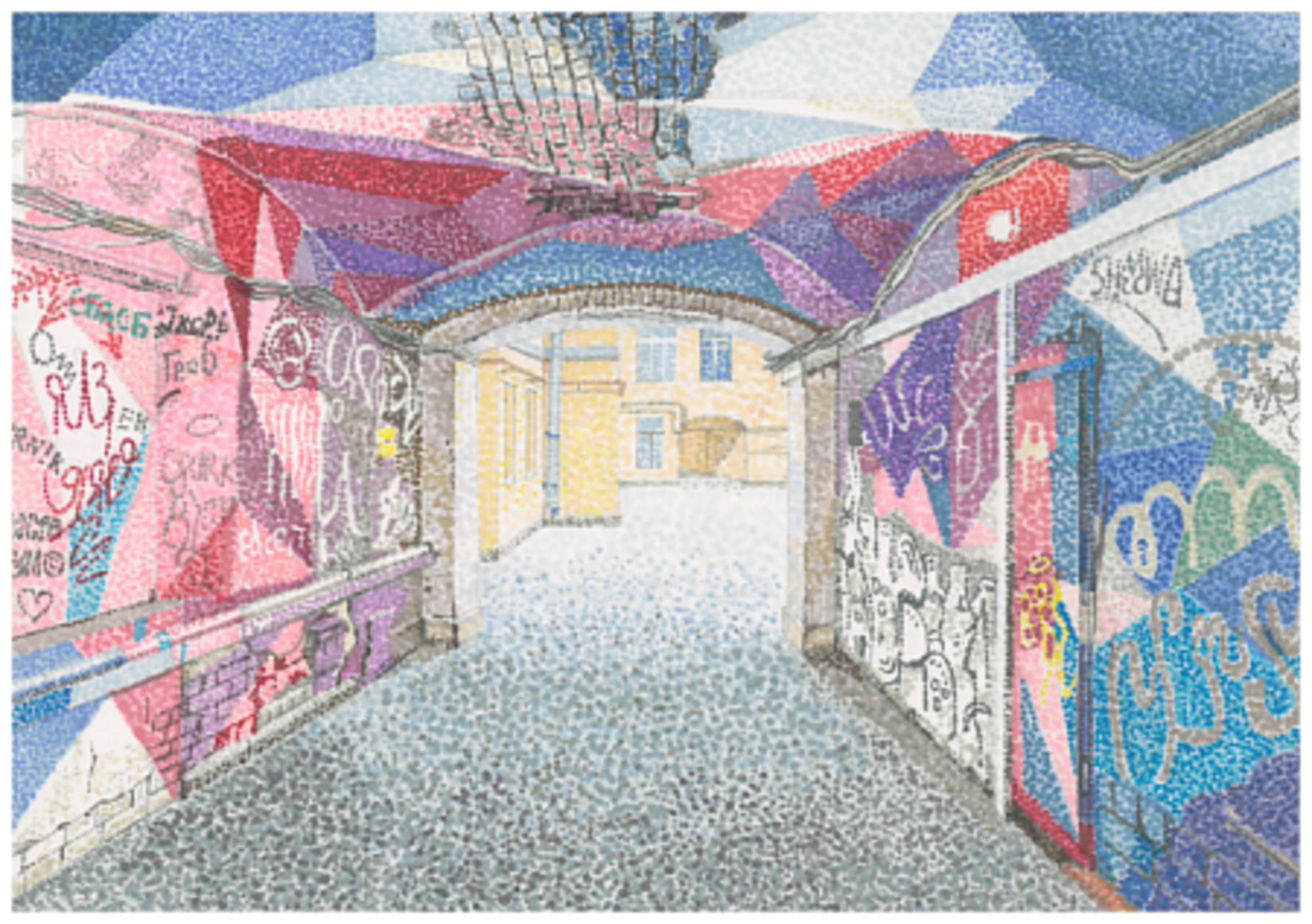 Люба Образцова переизобретает пуантилизм, раскладывая окружающий ее мир на атомы. Люба окончила художественное училище им. Рериха и успела поработать реставратором. Теоретическую базу Обрзацова добирала в Академии Художеств. С 2020 года входит в состав Новых городских художников. К наиболее ярким работам художницы относятся точечные серии графических листов. Серия «По дороге в диспансер» погружает в неспешную прогулку по обшарпанным дворам. В рамках издательского проекта AMINAZINE (который получил поддержку фонда Cosmoscow) был издан зин с «прогулкой», который теперь можно встретить во многих музейных библиотеках – от Гаража до Центра Помпиду. Еще одна серия, посвященная непарадному Нижнему Новгороду, появилась в 2025 году по итогам участия художницы в программе нижегородских арт-резиденций. Часть работ была представлена на Cosmoscow и полностью распродана в день превью. Также эти работы успели засветиться в галерее Пальто.