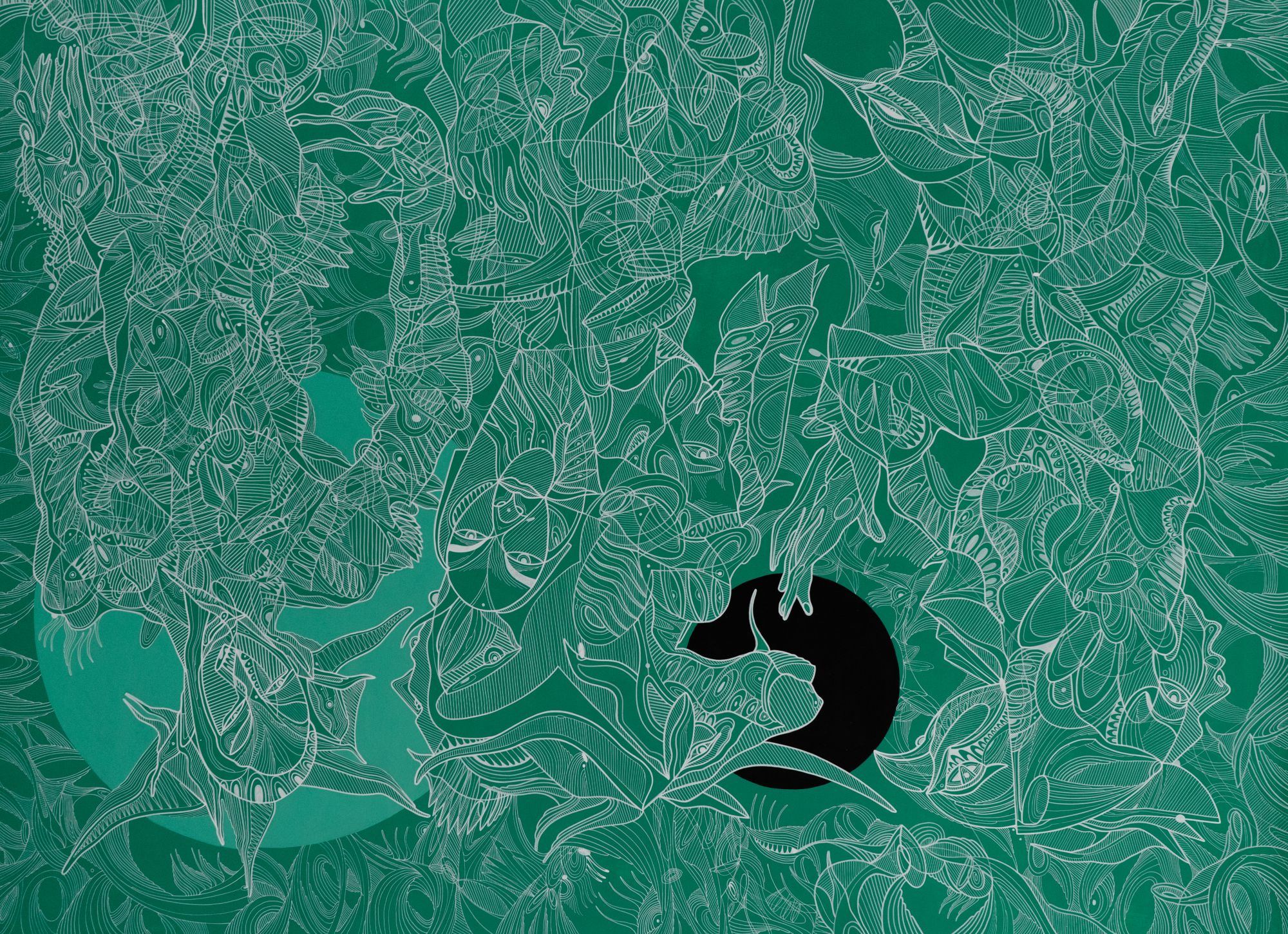 Плоскость холста для Аубукерова не терпит пустоты, нуждаясь в тотальном заполнении. Не имея начала и конца, его линии множатся, сплетаясь в сложные паттерны, подобно растениям или бактериям. Движение руки по плоскости оборачивается сложными нелинейными путешествиями зрительского взгляда в пространстве. Образы максимально заполняют поверхность, как флора. В способах их построения автор манипулирует большим количеством визуальных цитат - от Пауля Клее и Анри Матисса до Жана-Мишеля Баскии, Кита Хэринга и даже Маурица Эшера - объединяя присущие всем этим авторам сложные способы структурирования картинного пространства с ориенталистской орнаменталистикой, собственной восточной идентичностью.