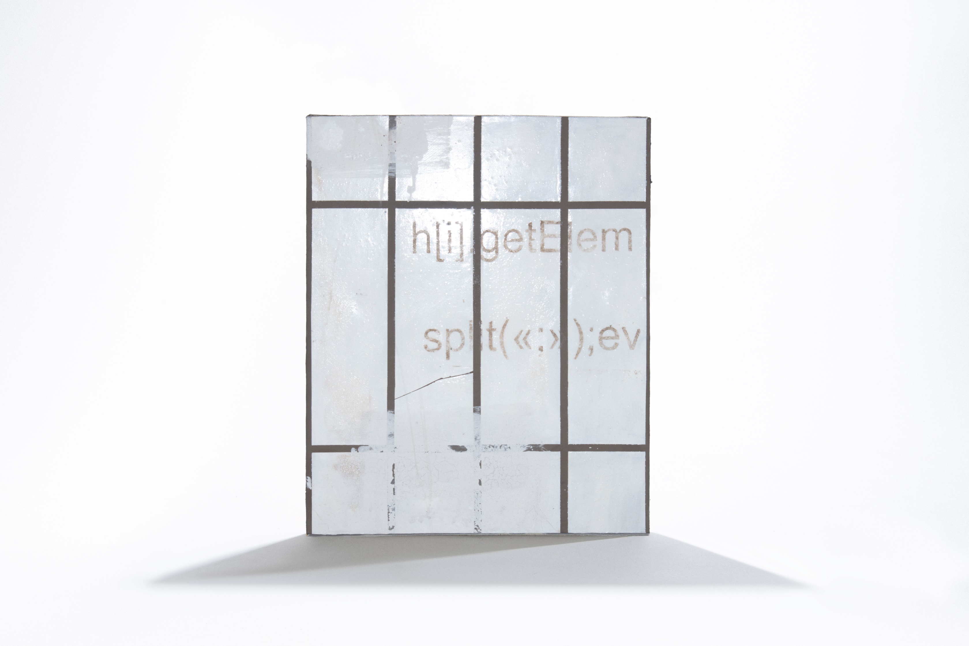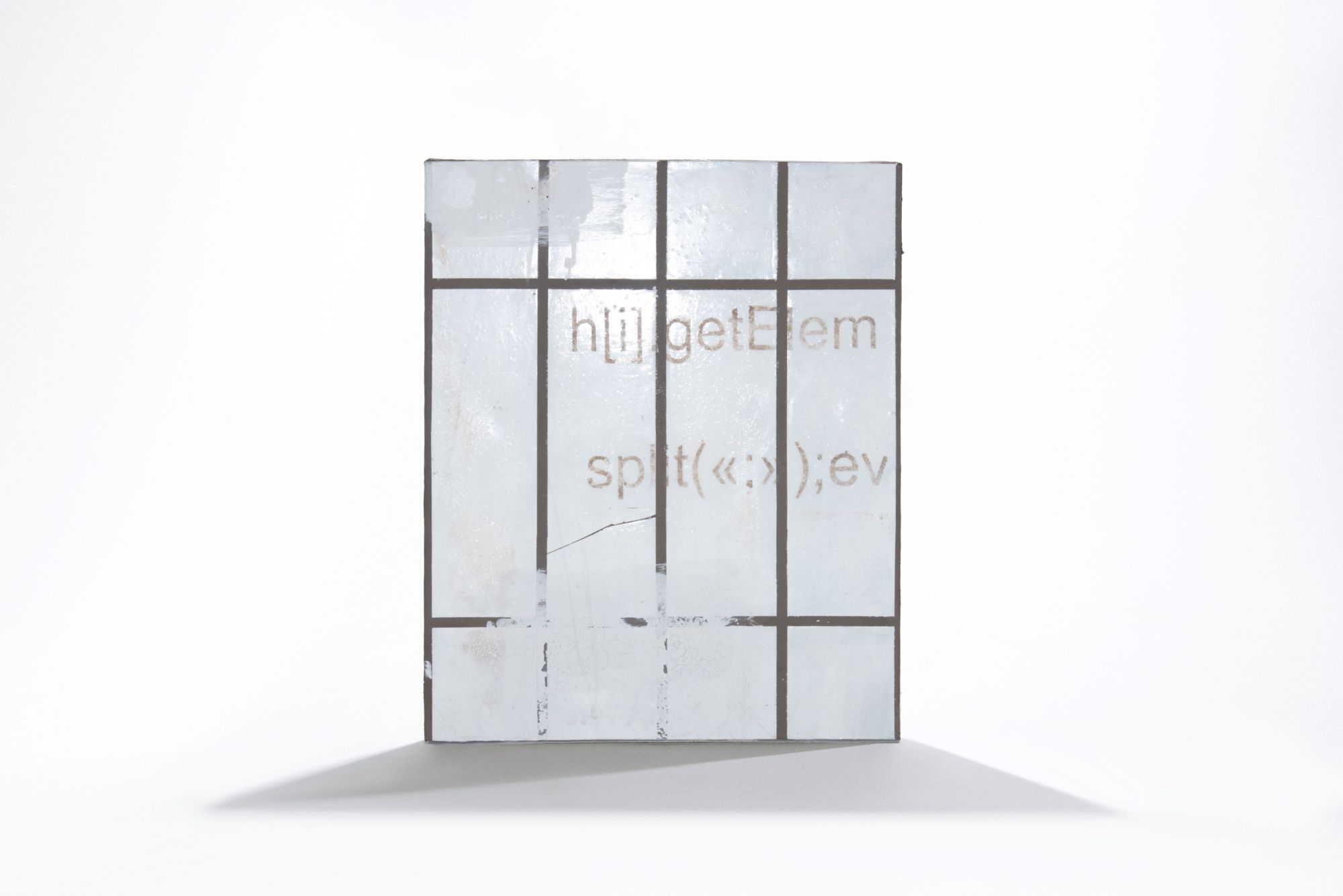 Городскую среду и интернет-пространство, по мнению художницы, роднит понятие «стены» как места, где появляются анонимные высказывания. в обоих контекстах эти высказывания могут подвергаться цензуре и стиранию. Здесь холст имитирует одну из привычных затёртых городских стен, а надпись на этой стене — код на языке программирования javascript, с помощью которого можно очистить страницу паблика в социальных сетях.