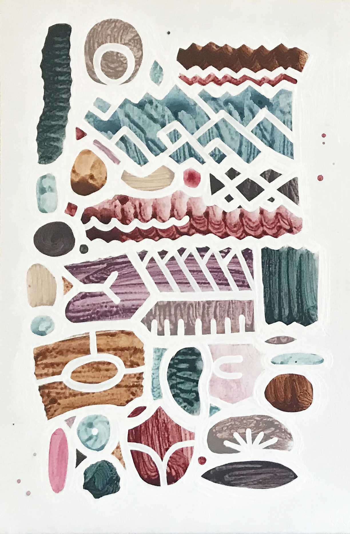 Не ограничивается в материалах и всегда находится в поиске: холст, рисовая бумага, дерево, ручная бумага, органические и синтетические объекты, а также предметы ready made, макрофотография и видео. Создает собственные инструменты для творчества.
