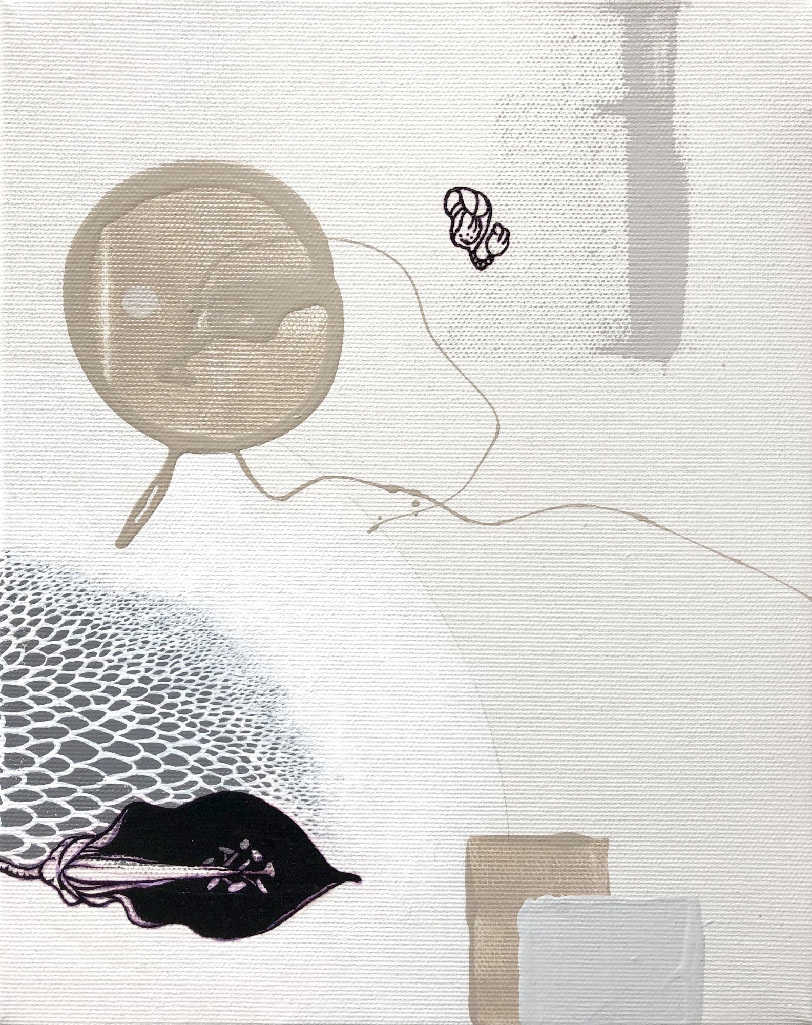 Не ограничивается в материалах и всегда находится в поиске: холст, рисовая бумага, дерево, ручная бумага, органические и синтетические объекты, а также предметы ready made, макрофотография и видео. Создает собственные инструменты для творчества.