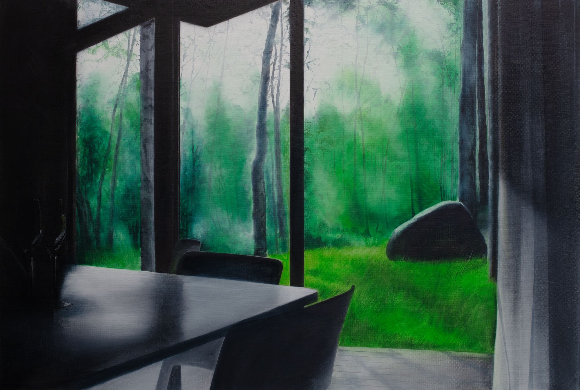 Eвгения Буравлева работает с понятиями пространства и времени. Используя классические приемы живописи, художник выстраивает отношения между пространством, временем и человеком внутри них. Персонаж произведений - это измученный современностью человек, вынужденный существовать в условиях мира пост-истины, одинокий герой на пороге принятия решения. Пространство и время в работах связаны с персонажем и зависят от его действий, они пока отделены и не освоены, зависли в режиме ожидания.