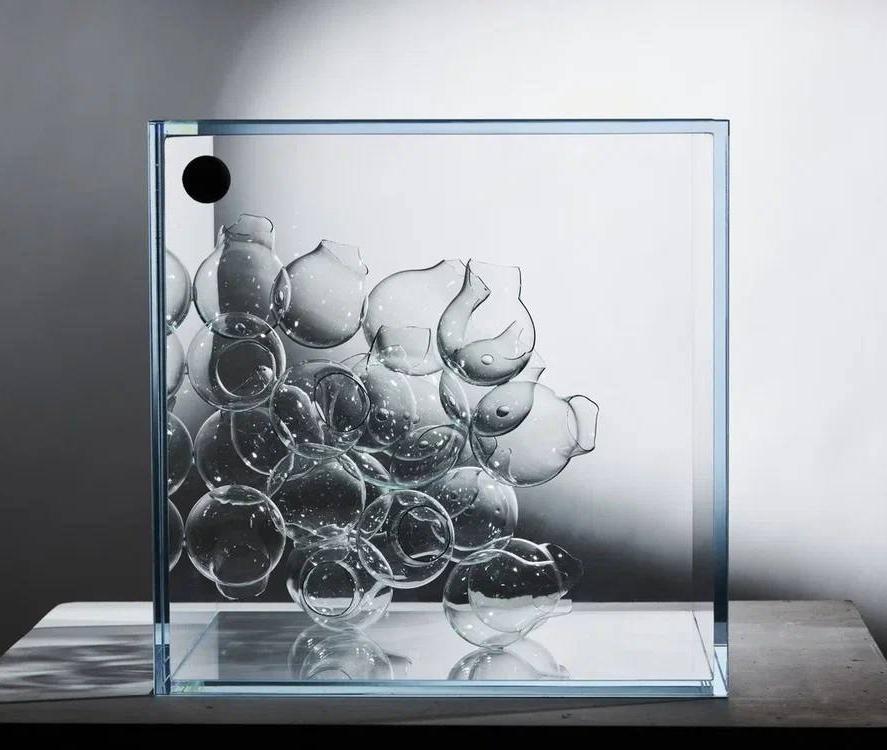 Скульптуры серии «Период полураспада» из битого стекла, отсылают к темам мироздания и космоса. Они символизируют запечатленный результат выброса энергии, не поддающийся какому-то регламенту. Осколки стекла, словно фракталы, обладающие свойством самоподобия, самостоятельно рисуют дальнейший образ, собираясь в хаотичном порядке. Непредсказуемо объединяясь, они превращаются в источник необузданной динамики, создавая отдельный, новый мир, ограниченный формой своего куба.
