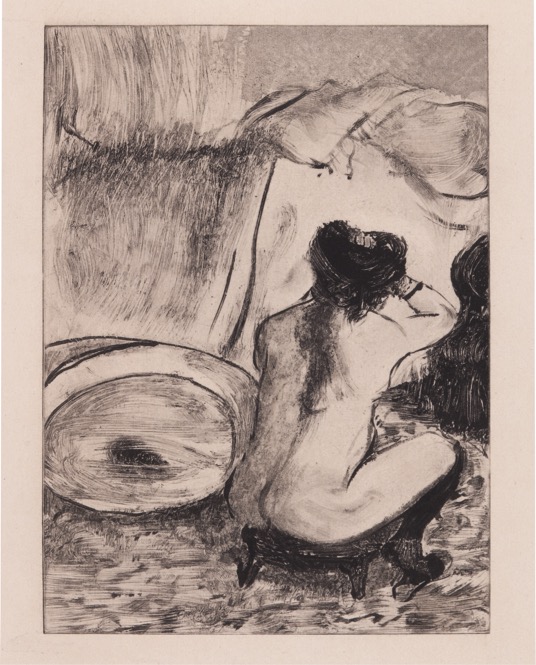 Гравюра из цикла иллюстраций к книге «Разговоры гетер» античного писателя Лукиана. Роскошное издание вышло выпущено известным коллекционером Амбруазом Волларом ограниченным тиражом – всего 305 экземпляров. В качестве иллюстраций Воллар использовал серию монотипий Дега «Сцены в закрытых домах», ранее неизвестную широкой публике. Оригинальные монотипии Эдгара Дега были переведены в офорты гравировщиком Морисом Потеном. Иллюстрации к «Разговорам Гетер» дошли до нас чудом, так как работы подобного рода имеют отношения к интереснейшей и очень небольшой части творчества художника. Эти чрезмерно, можно даже сказать, избыточно эротичные иллюстрации - совсем иная, непривычная зрителю грань гения Дега. Книги с иллюстрациями, к которым относится данная работа, были выпущены уже после кончины художника, в середине 1930-х годов, а главной ценностью изданий, конечно же, являются иллюстрации. Эти работы Дега не публиковались при жизни художника, а впоследствии разошлись по разным коллекциям или были вовсе утрачены. Большая же часть рисунков была уничтожена братом самого художника не желая оставлять память о мастере запятнанной. Графические работы, созданные на скорую руку художником, видели совсем немногие привилегированные люди, в их числе Ренуар, приходящий от этих работ в восторг. Доподлинно известно, что один экземпляр книги "Разговоры гетер" принадлежал Пикассо, который сейчас находится в коллекции Лувра.