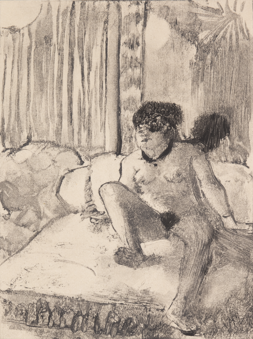Гравюра из цикла иллюстраций к книге «Разговоры гетер» античного писателя Лукиана. Роскошное издание вышло выпущено известным коллекционером Амбруазом Волларом ограниченным тиражом – всего 305 экземпляров. В качестве иллюстраций Воллар использовал серию монотипий Дега «Сцены в закрытых домах», ранее неизвестную широкой публике. Оригинальные монотипии Эдгара Дега были переведены в офорты гравировщиком Морисом Потеном. Иллюстрации к «Разговорам Гетер» дошли до нас чудом, так как работы подобного рода имеют отношения к интереснейшей и очень небольшой части творчества художника. Эти чрезмерно, можно даже сказать, избыточно эротичные иллюстрации - совсем иная, непривычная зрителю грань гения Дега. Книги с иллюстрациями, к которым относится данная работа, были выпущены уже после кончины художника, в середине 1930-х годов, а главной ценностью изданий, конечно же, являются иллюстрации. Эти работы Дега не публиковались при жизни художника, а впоследствии разошлись по разным коллекциям или были вовсе утрачены. Большая же часть рисунков была уничтожена братом самого художника не желая оставлять память о мастере запятнанной. Графические работы, созданные на скорую руку художником, видели совсем немногие привилегированные люди, в их числе Ренуар, приходящий от этих работ в восторг. Доподлинно известно, что один экземпляр книги "Разговоры гетер" принадлежал Пикассо, который сейчас находится в коллекции Лувра.