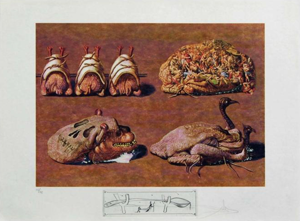 Данная работа представляет собой одну из иллюстраций к кулинарной книги «Les Dîners de Gala», созданная в свойственной Дали сюрреалистической манере.