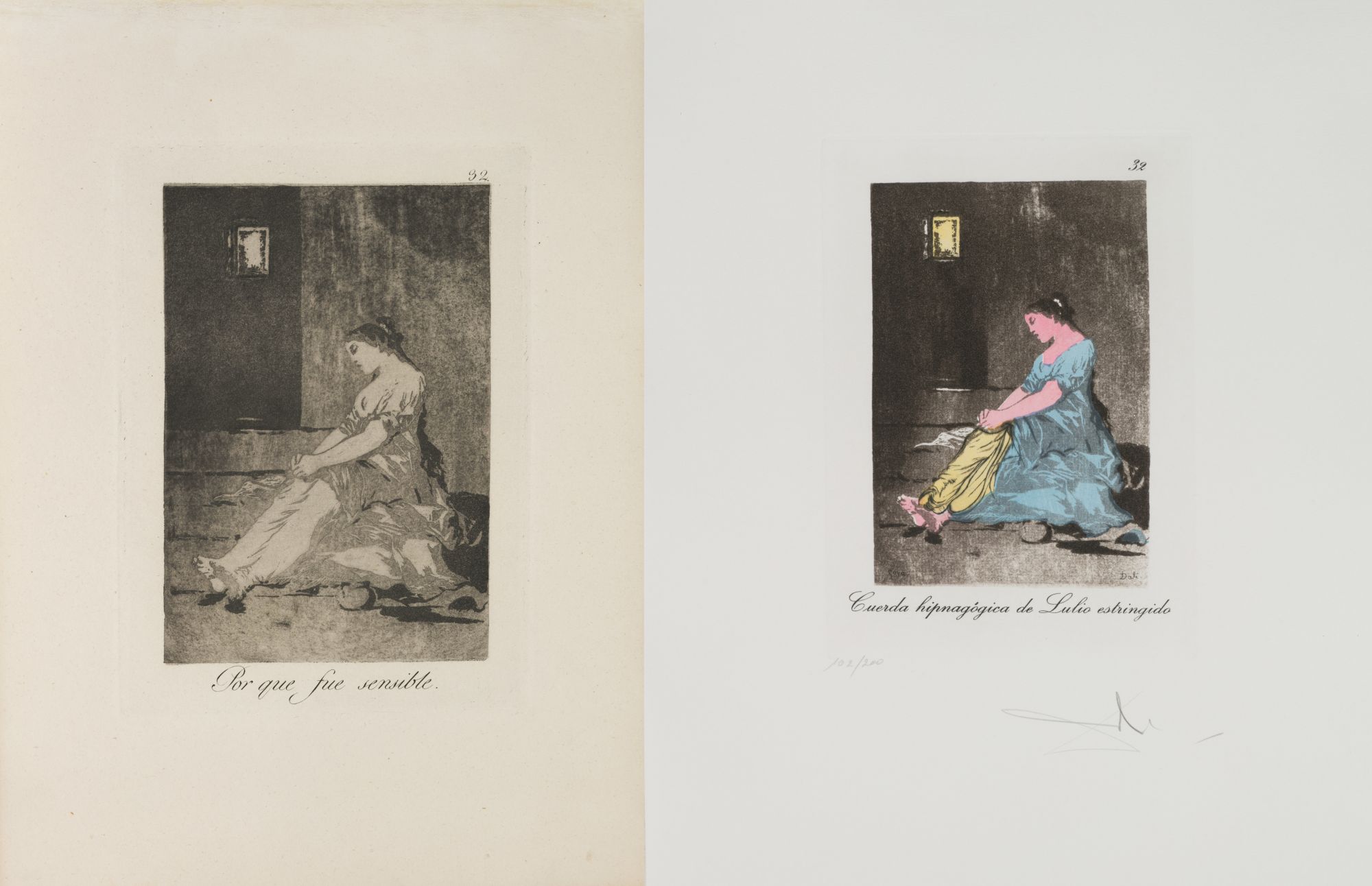2. Работа из серии Капричос Гойи Сальвадора Дали, лист номер 32. Пронумерован в левом нижнем углу 102 номером из 200 экземпляров, выполнена на веленевой бумаге Rives. Подписана художником карандашом в правом нижнем углу