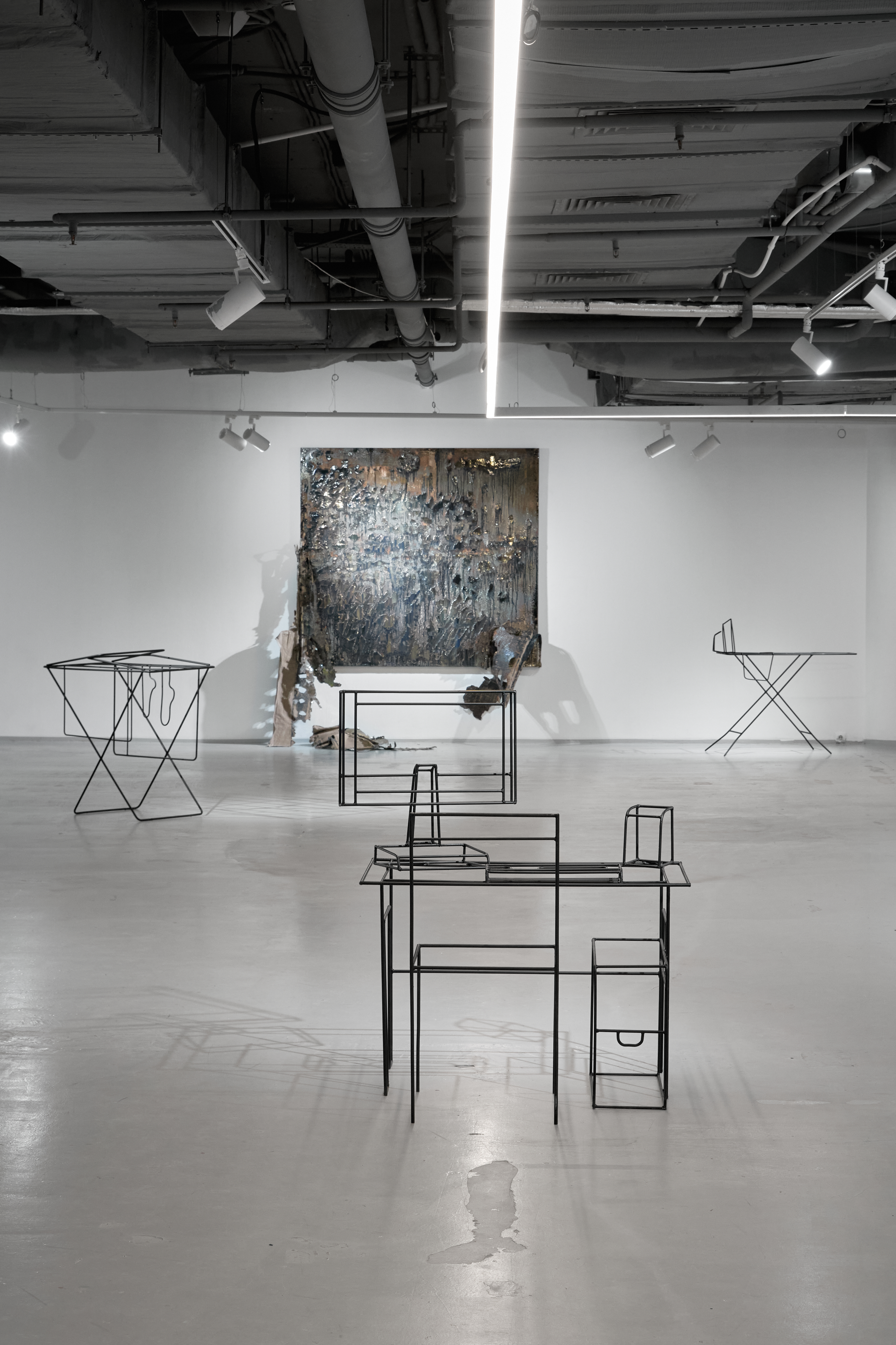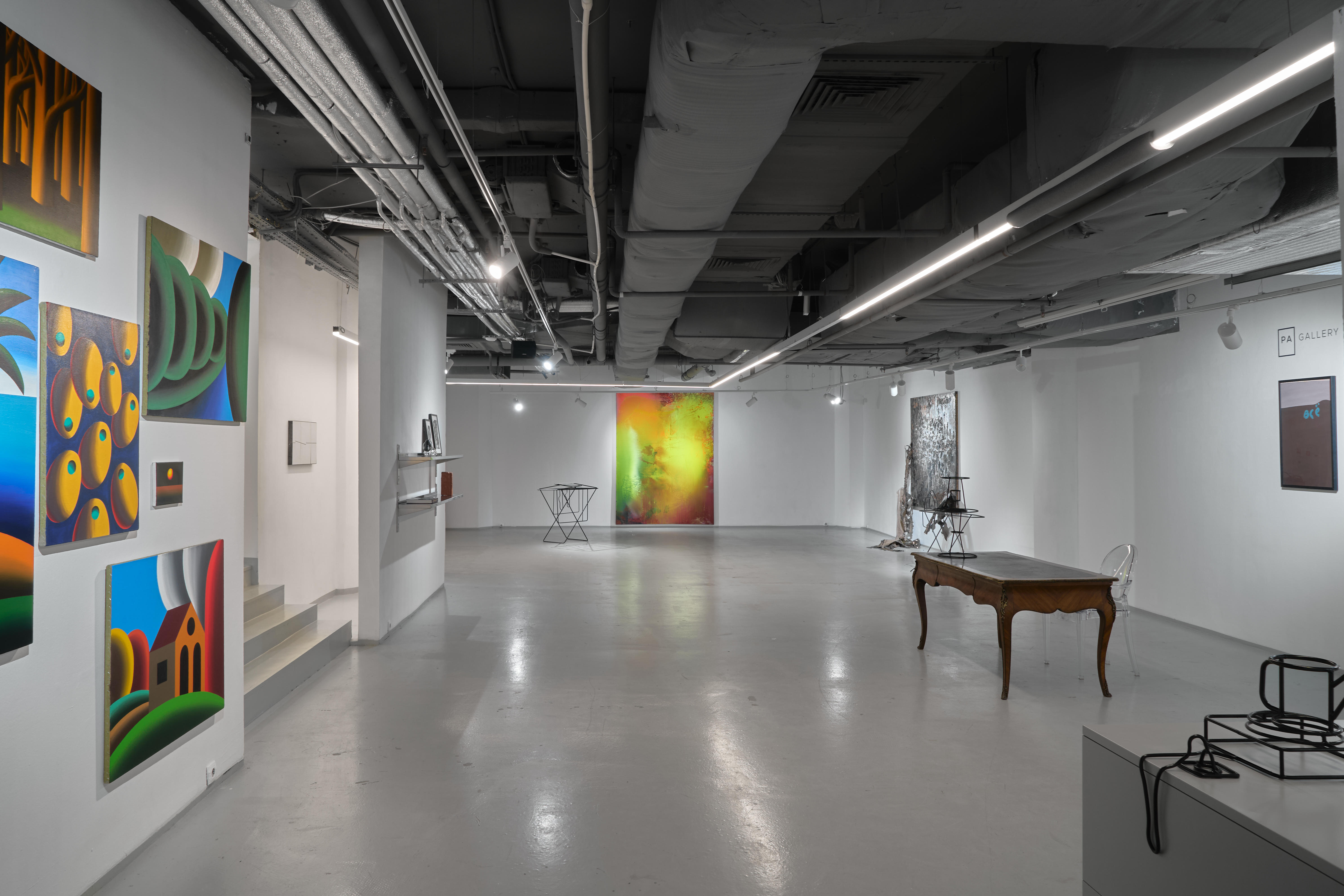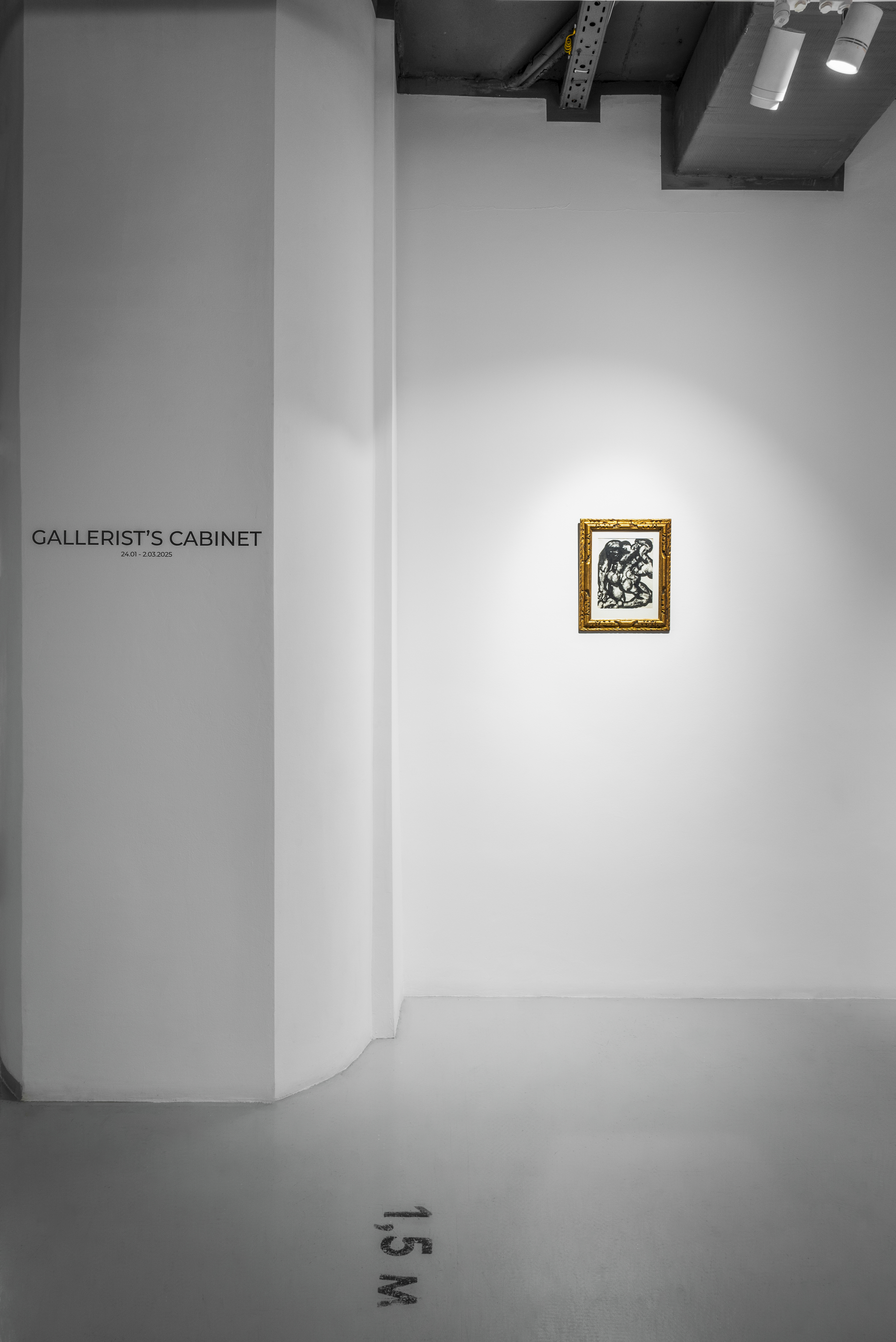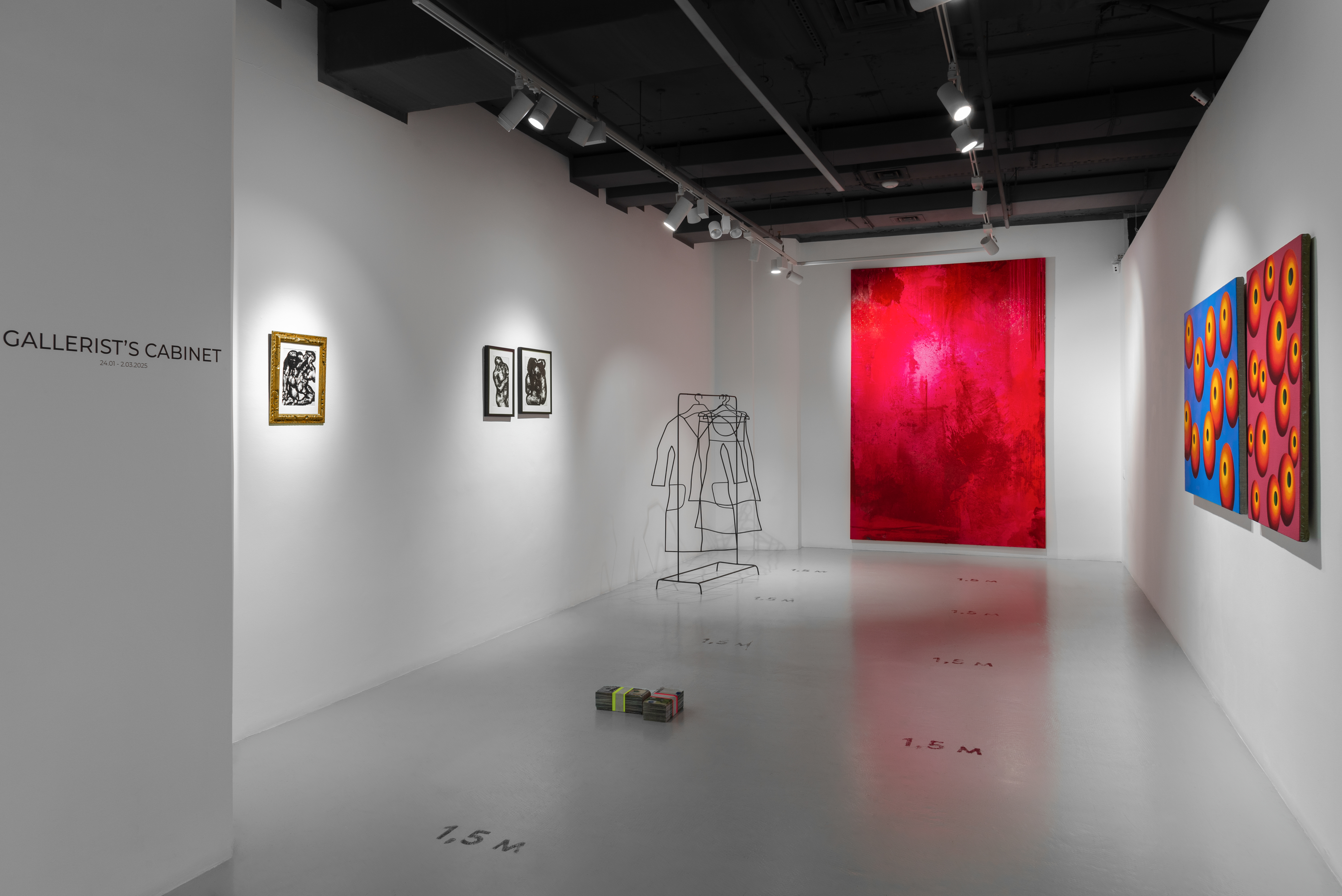 «Кабинет галериста» представляет не только работы всех авторов, с которыми работает PA Gallery, но и частные собрания ее владельцев. Будучи собранными вместе, они начинают отражаться друг в друге. Каркасные металлические конструкции Ани Жёлудь, сводящие повседневные предметы – гладильную доску, пианино, торшер – к контурам их границ, замыкающих пустоту, вступают в диалог с танцующими изогнутыми траекториями Евгения Михнова-Войтенко, образованными выдавленной из тюбиков краской. Энергичная графика Евгения Чубарова, в которой «пузырящиеся» телесные объемы превращаются в беспредметные монохромы, занимая целую стену в духе типичной для кабинета редкостей шпалерной развески, отражается в монументальной живописи Алисы Гореловой, сопоставляющей физиологию и мимесис в ощущении жизни как материального потока. Зеркальные полотна Антона Конюхова, хранящие на себе травмирующие жесты-удары, рифмуются с поверхностями Владимира Трямкина, выстроенными как шероховатая дырявая терка – оптическая ловушка для «застревающего» в ней зрительского взгляда. Тотально гладкий, лишенный шероховатостей и нестыковок предметного мира пейзаж Олега Хвостова встречает своих антиподов – поверхности Андрея Волкова, чья одухотворенная красочность подобна океанической стихии, или, с другой стороны, экспрессивные мазки Владислава Зубарева. Наконец, кирпичи, плитки и книги Андрея Сяйлева, имитирующие сбои в восприятии, или сюрреалистичные фарфоровые объекты Анны Казьминой сами по себе выглядят как «диковинки» в лучших традициях кабинета чудес.