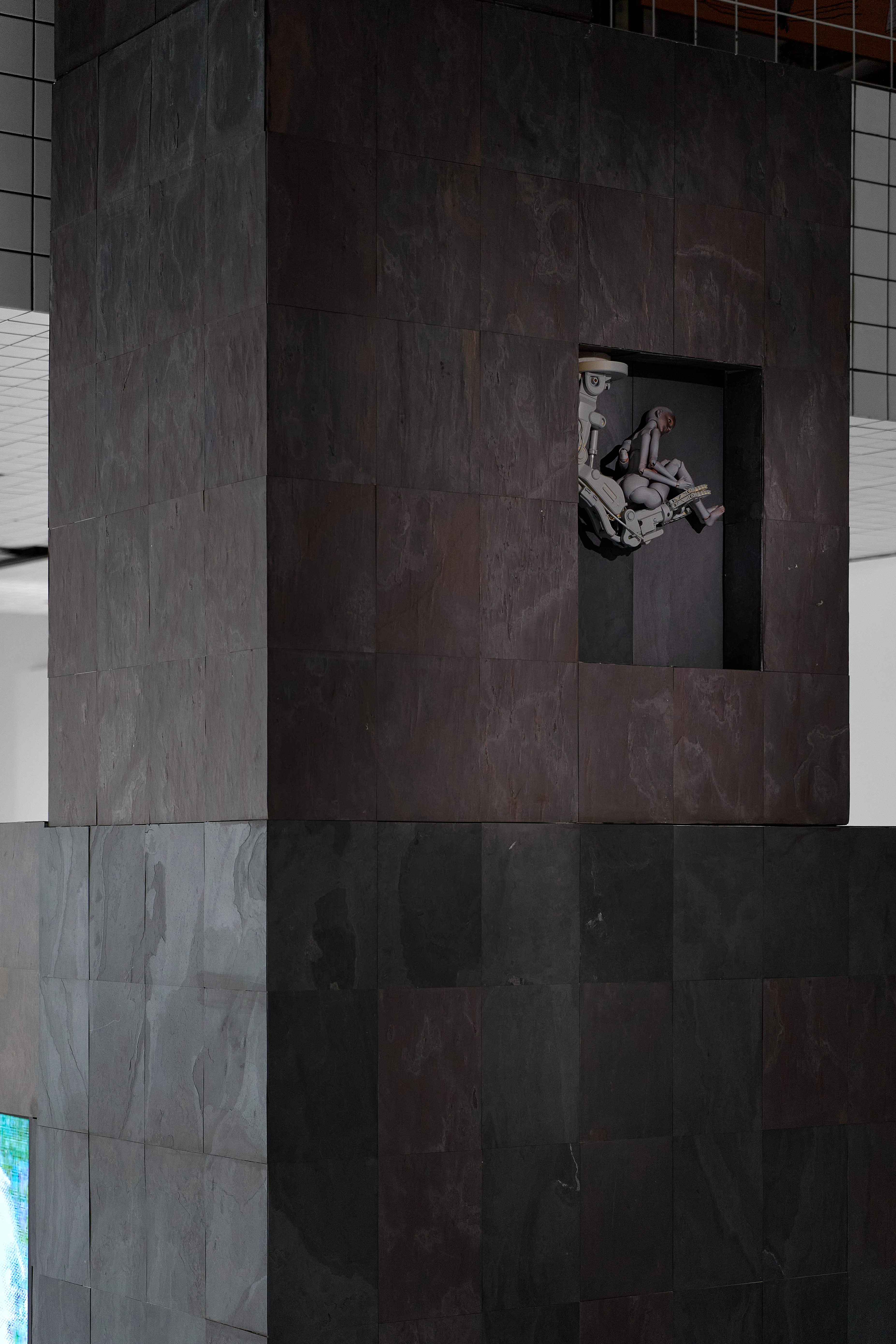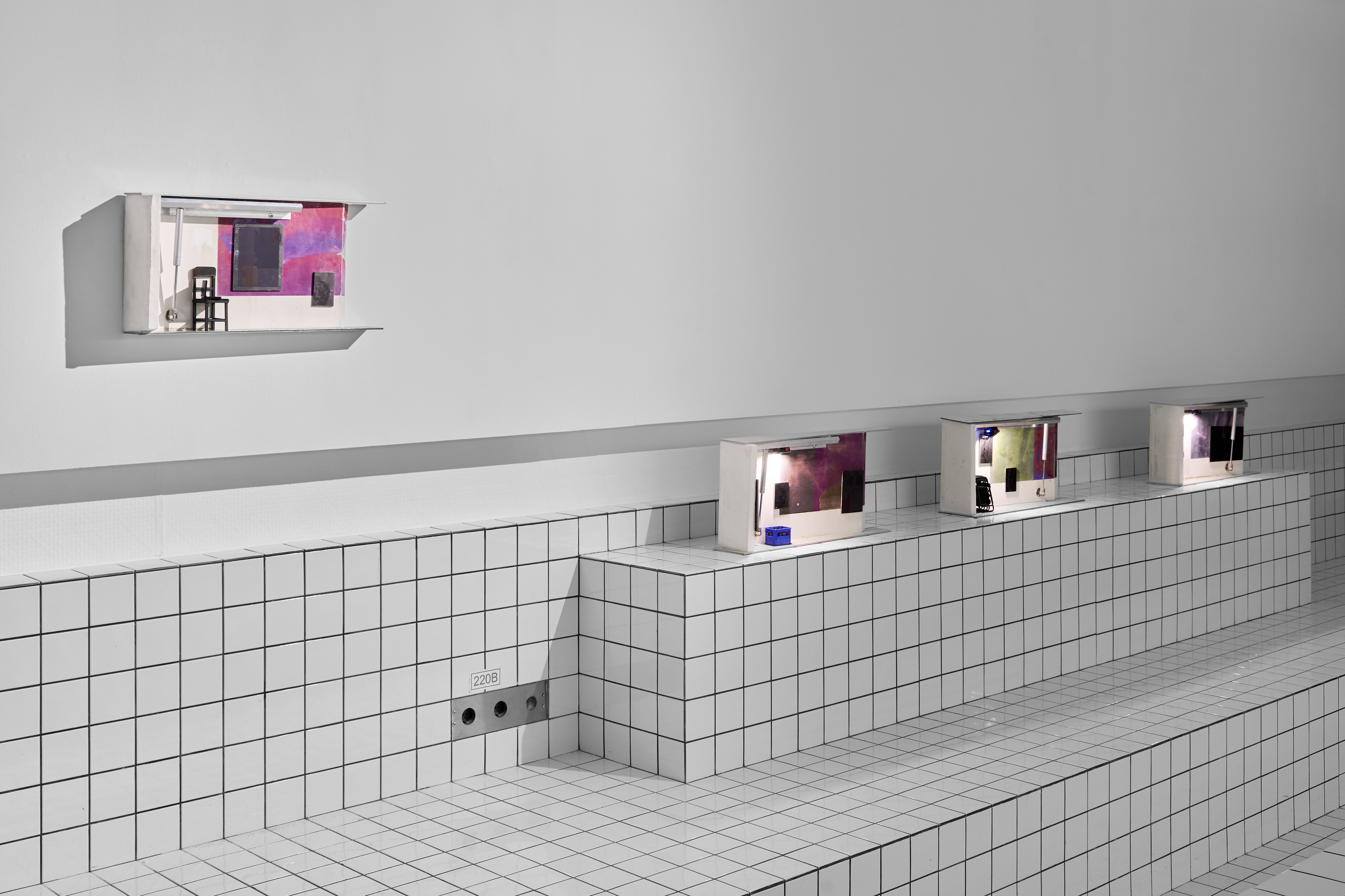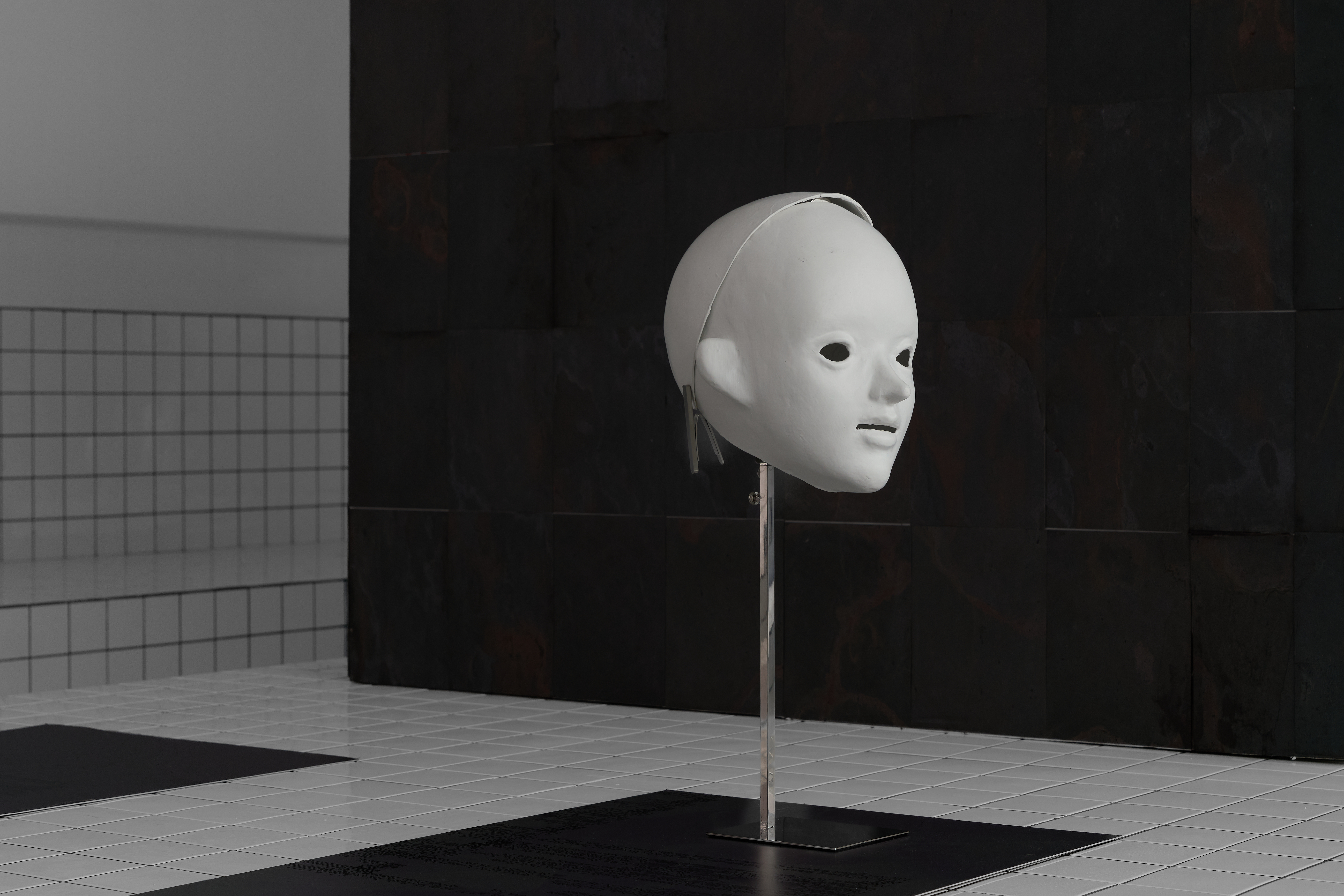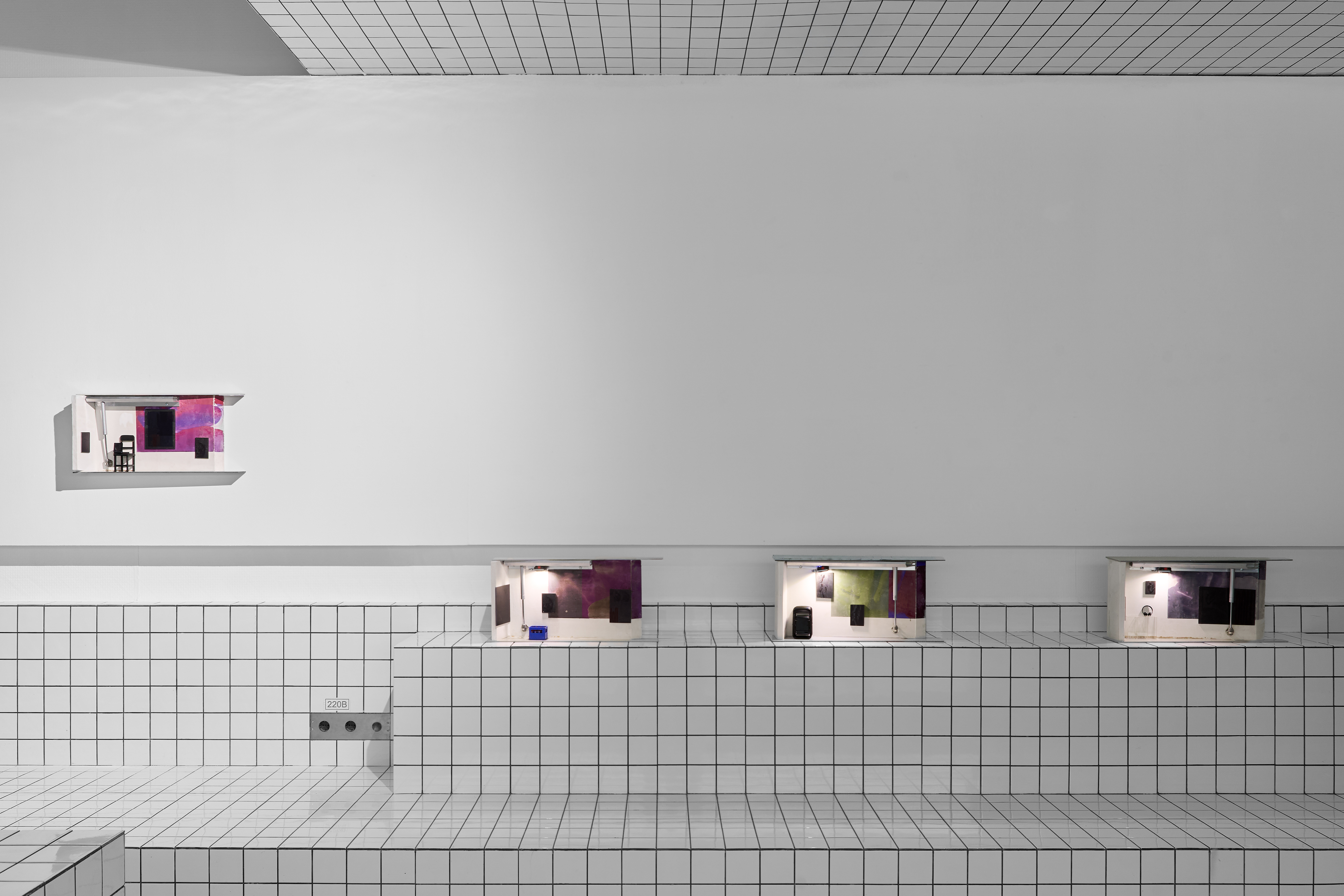 В экспозиции представлена масштабная мультимедийная инсталляция, интегрированная в архитектуру галереи, а также серия среднеформатных объектов, имитирующих институциональные выставочные пространства.