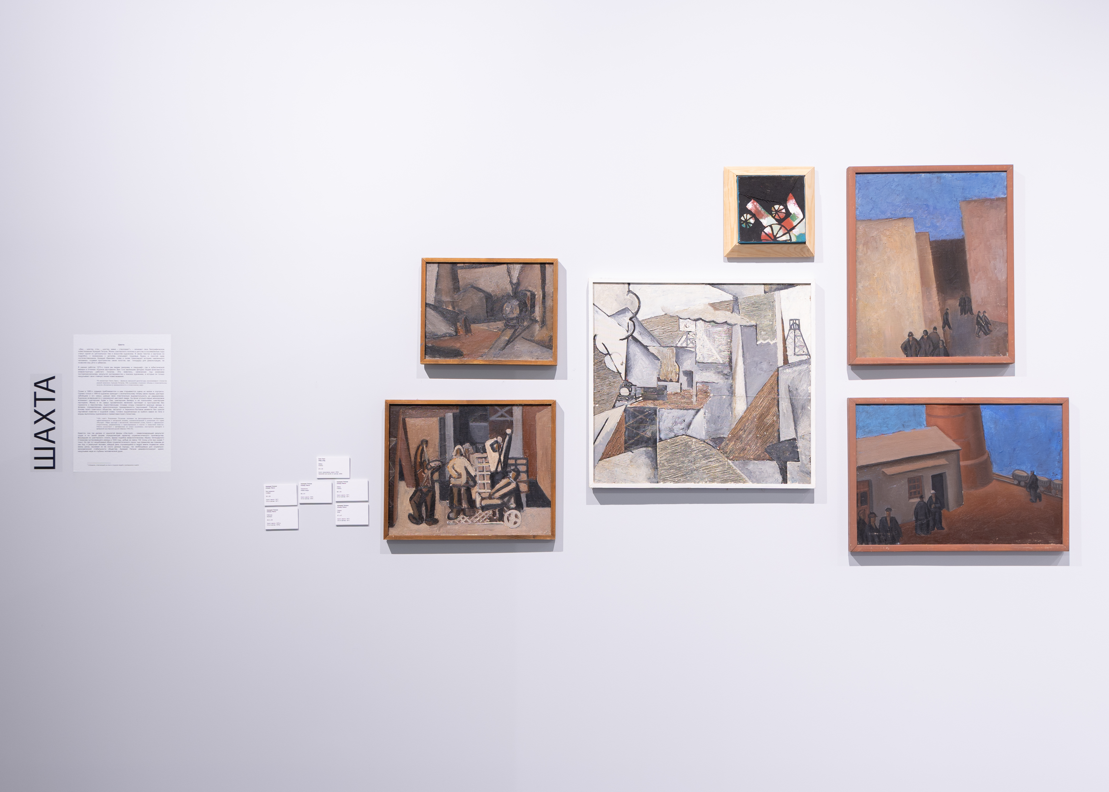 Экспозиция выставки поделена на главы – четыре основные темы, выделенные куратором. Раздел «Шахта» – блок работ, связанный с детским опытом художника, родившегося в посёлке Шахты Комсомолец возле Горловки, где на добыче угля работали его родители. Продолжает тему социалистического труда глава «Служба», в которой собраны произведения, связанные с концептом долга в разных его проявлениях. В качестве противопоставления в разделе «Отдых» представлен блок работ, иллюстрирующий свободное время труженика: праздник, перекур, долгожданная поездка на Черное море. И завершает экспозицию тема «Памяти», в рамках которой будут собраны произведения, описывающие романтические и похоронные ритуалы, фиксирующие важные события в жизни маленького человека.