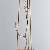 На этом же диалоге с пространством построена и другая работа, где тот же стремительный поток бегущего ручья разомкнут и взвинчен подобно гигантскому воздушному змею. Он продет сквозь камень и прошит лучом копья. Это сопряжение разных типов форм знаменует выраженное здесь символическое начало. Золотые круги, отлитые в форме диска, также взаимодействуют с дикими камнями в серии скульптур, рассекая их пополам и крест-накрест.
