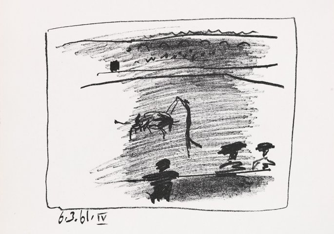Данная работа входит в цикл "Los Toros", состоящий из одной цветной и трех черно-белых литографий. Для создания этого эстампа использовалось больше 20 литографских камней. Los Toros — книга Хайме Сабартеса, повествующая о тонкостях и нюансах уходящей корнями в древность традиции корриды. Хайме Сабартес — каталонский скульптор, писатель, публицист, поэт, коллекционер, жизнь которого была тесно связана с Пикассо, особенно начиная с 1935 года, когда по приглашению художника Сабартес стал его личным секретарем, архивариусом, делопроизводителем и биографом. Они были знакомы ещё с юности; в начале 1900-х годов они много пересекались, осваивая артистическую жизнь Парижа. После возвращения Сабартеса в Европу, после его длительной поездки в Южную Америку, друзья восстанавливают контакты, и Сабартес становится незаменимым помощником Пикассо.