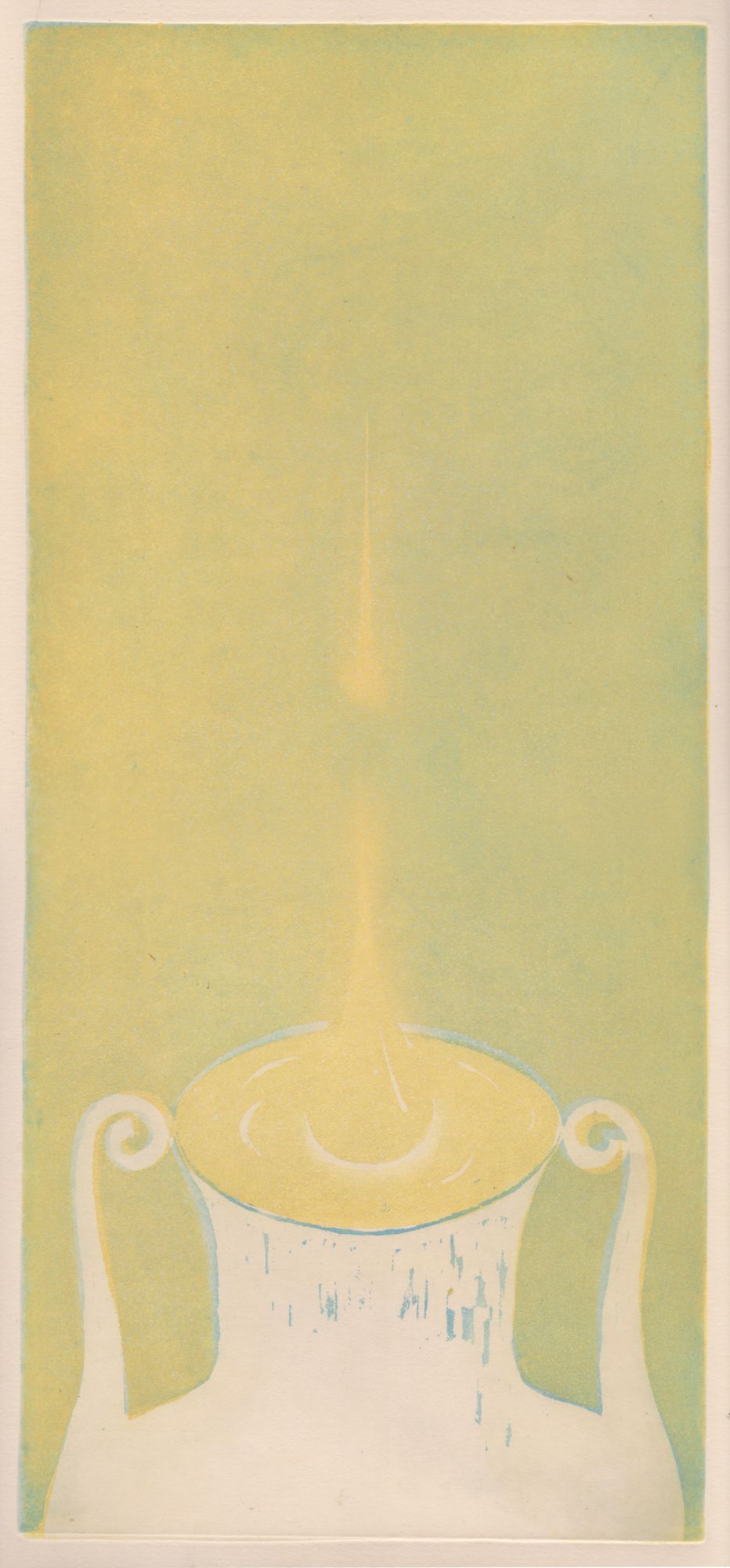 Серия выполнена в технике цветного офорта и акватинты — печатной графики, позволяющей работать с мягким тоном и пятном, создавая эффект, напоминающий заливку акварелью или тушью. Свет, словно льющийся изнутри, становится метафорой любви, наполняющей пространство, а тёплая цветовая гамма усиливает это ощущение мягкого, рассеянного сияния. Пейзажи приобретают черты ирреальности: они лишены конкретности и существуют как пространства переживания, в которых внутреннее состояние переводится в визуальную форму.