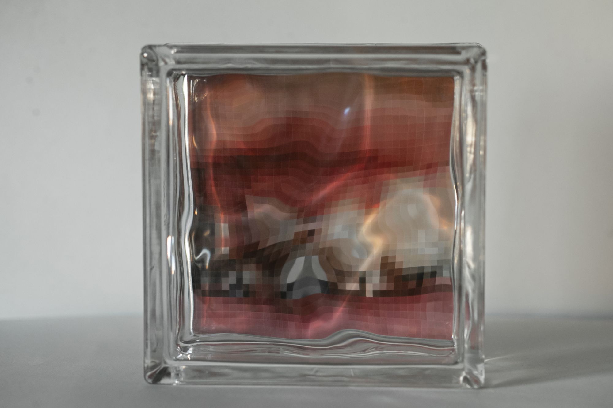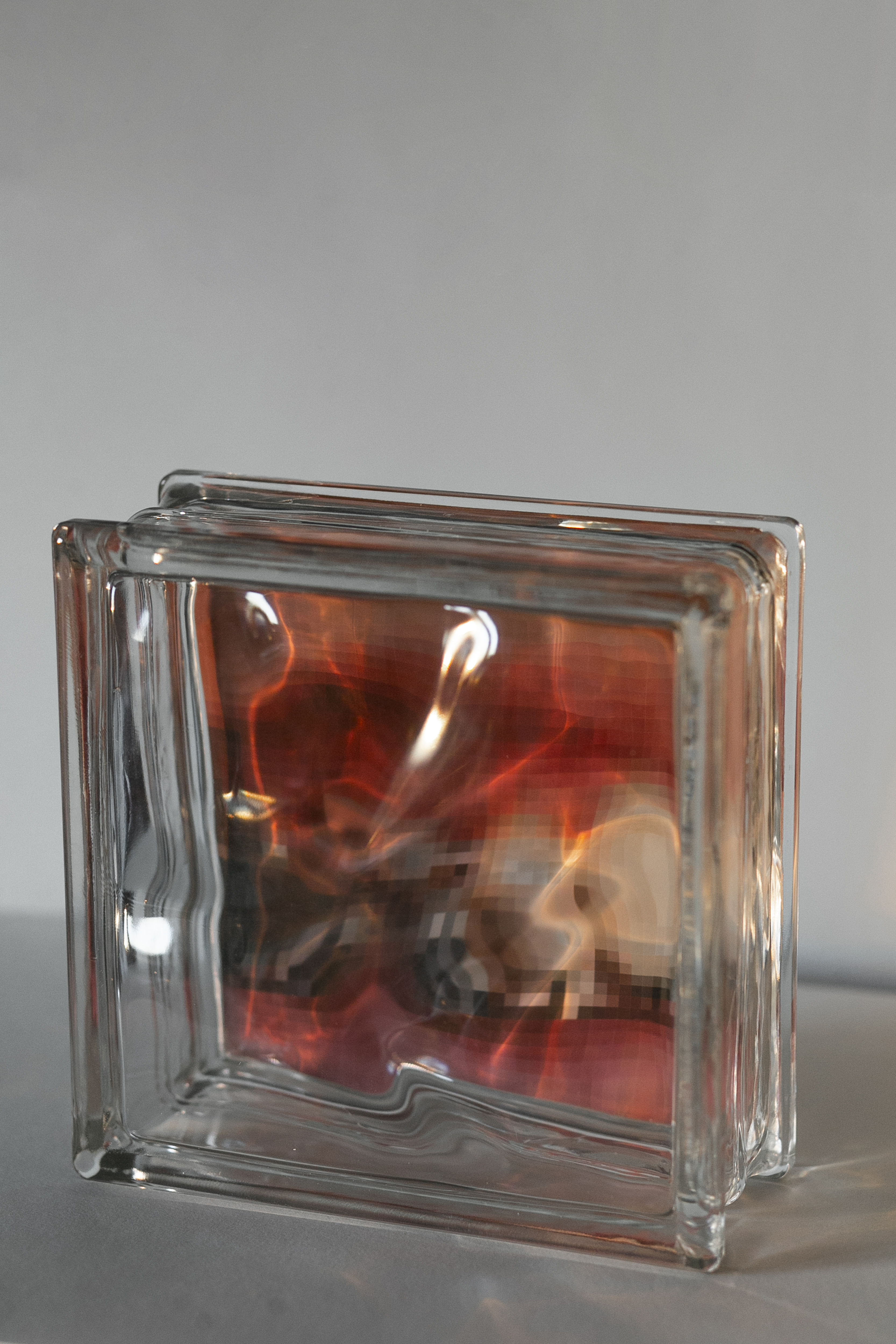 Работы экспонируются через стеклоблоки — архитектурные элементы, которые пропускают свет, но искажают видимость. Стеклоблоки превращаются в пиксельные контейнеры памяти — метафорические экраны, на которых репрезентация тела становится зыбкой, недоступной, но ощутимо присутствующей. Проект говорит о парадоксе: о стыде, который действует ещё до изображения, до кадра. Он исследует визуальные следы неснятого — и предлагает способ вернуть им хрупкую форму существования.