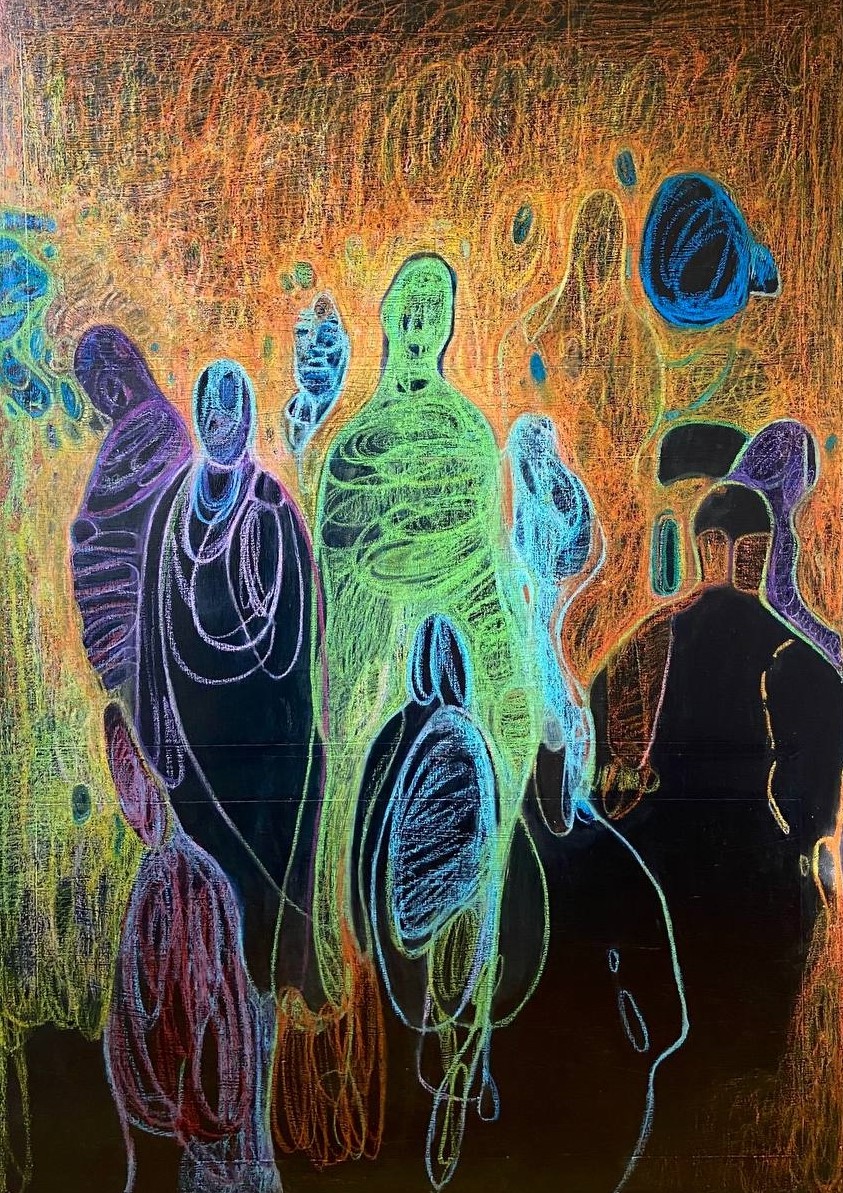 «Ожидание» продолжает серию работ на темном фоне, выполненных масляной пастелью, маслом и акрилом. Серия данных работ образовалась в самом начале проекта и сформировалась в целый цикл. Темный фон не олицетворяет собой мрак или пустоту, он является лишь другим светом, на котором проявляются сконструированные автором образы, переходные состояния из мерцающих силуэтов. Каждый из образов не спорит с другими, он гармонично сосуществуют с ними и с самим собой. Каждый находится среди другого, вплетаясь в общий разноголосый хоровод.