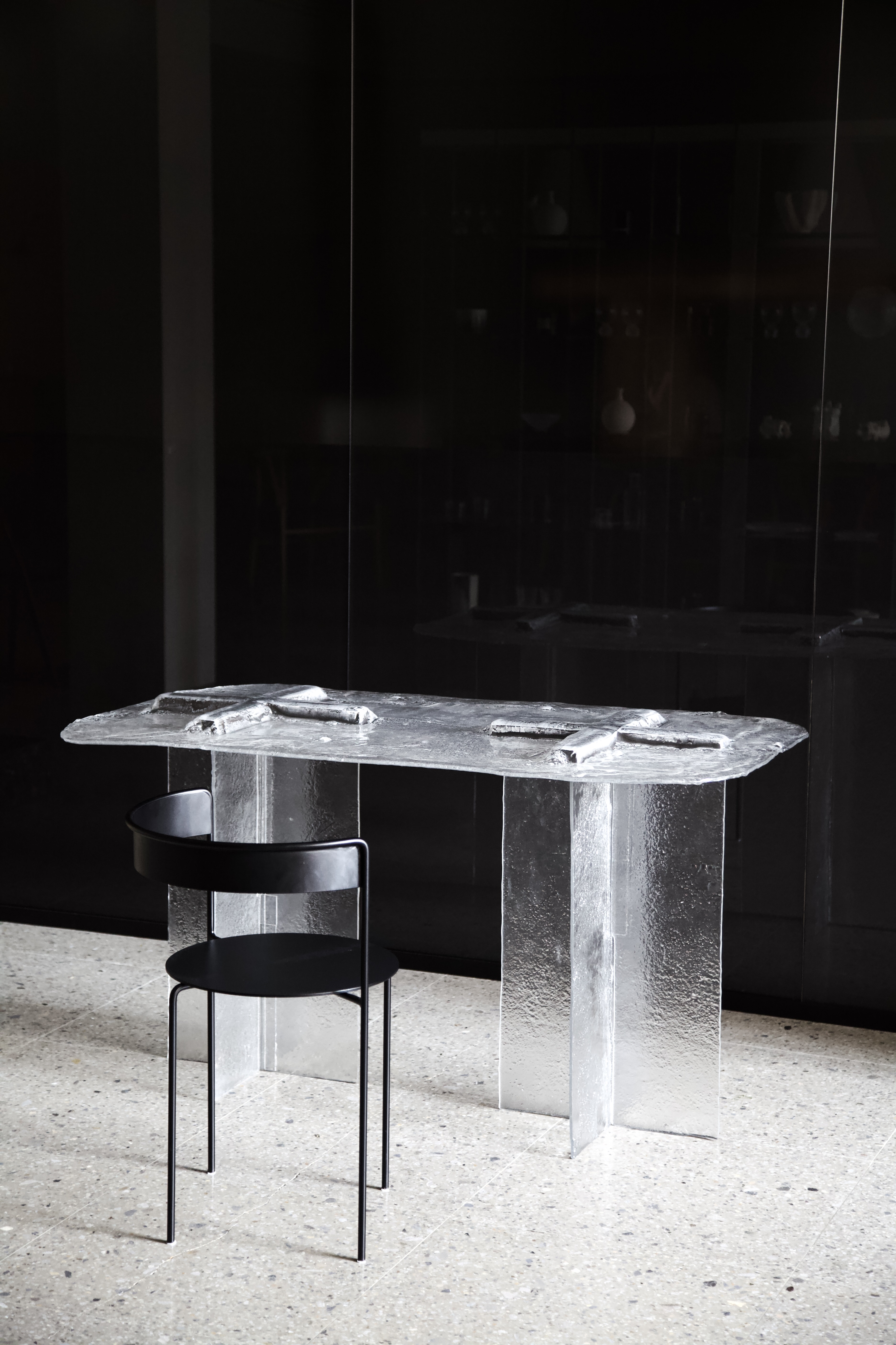 В коллекции автор демонстрирует архитектурный взгляд на предметный дизайн. Авторской философией DROZHDINI является совмещение нескольких языков дизайна в единое целое. Концепцией проекта является философия ценности в простоте. Стол выполнен из пяти монументальных стеклянных блоков, собирающихся по принципу конструктора. Фактура и конструктивные детали несут в себе отсылку к японской культуре. Чистота линий, живая фактура, простые и геометрические формы наполненные эстетикой минимализма.