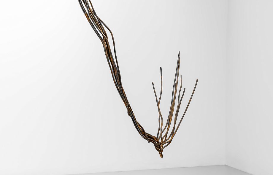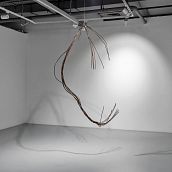 Однако то, что должно служить объединению и бесперебойной работе, поломано. Одни провода насильно разорвали, другие — смотали и повесили в ряд. Они так долго висят неиспользованные, что провисли под собственным весом и оборвались. Нынешняя серия скульптур больше не говорит о «связи всего со всем», как близкая по форме инсталляция «Коммуникации», которую художница сделала для 53-й Венецианской биеннале в 2009 году (тогда металлические провода продолжались в пространственной графике и иллюзорно оплетали весь павильон). Напротив — она обнажает вселенскую разобщенность, полость не каких-то отдельных вещей, а всего мира, который многочисленные коммуникации безуспешно пытаются соединить.