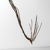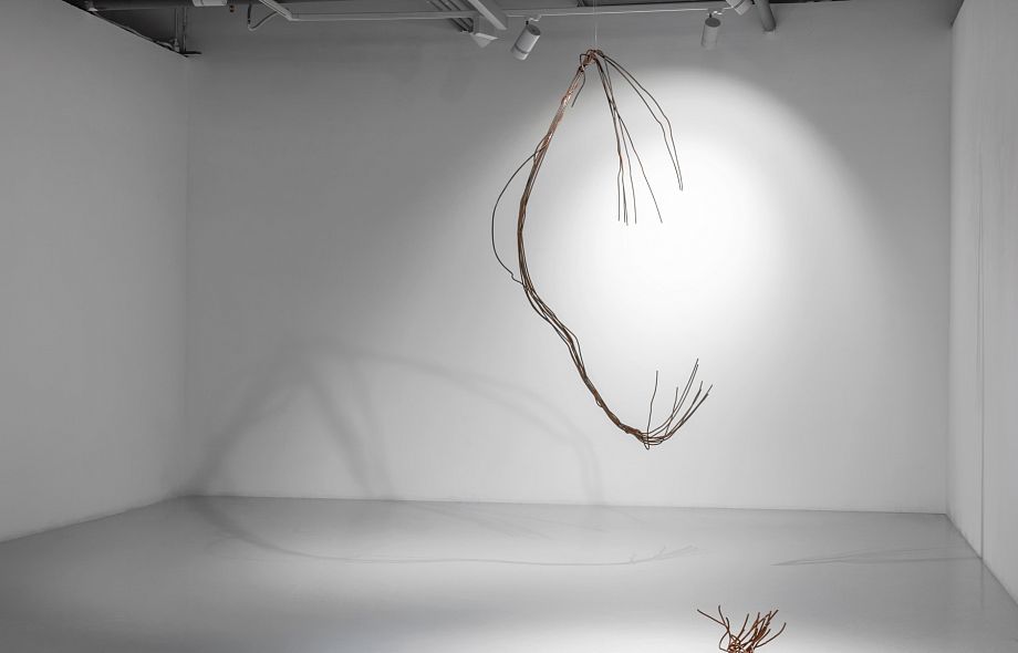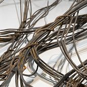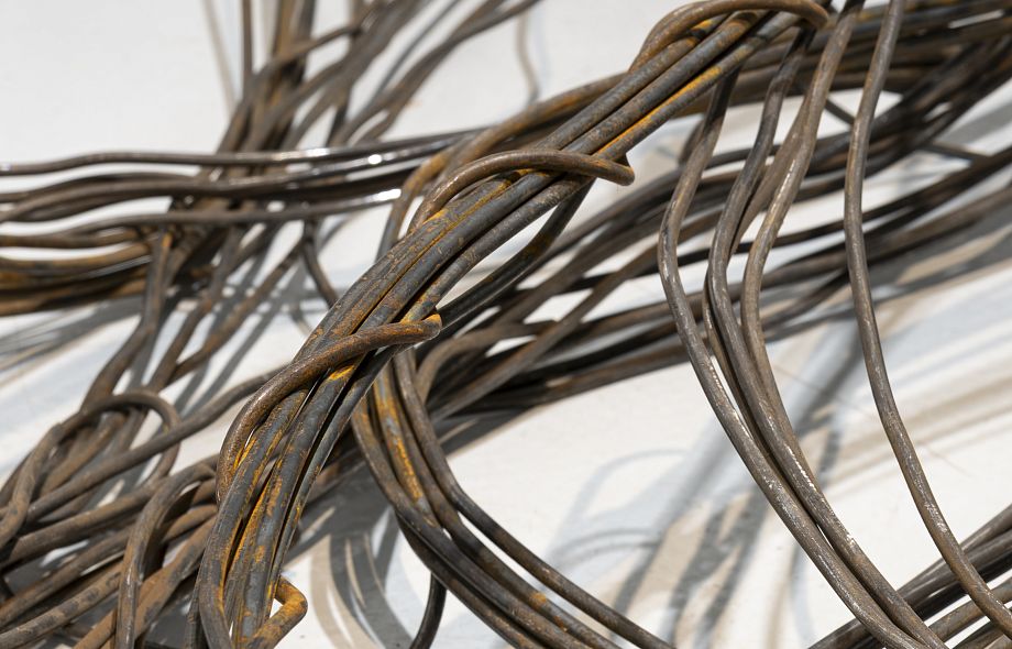 Такова и новая серия работ Ани Жёлудь. В этот раз, используя традиционный для себя материал — металлический прут, — художница отказалась от его привычной функции. Если раньше с помощью него она рисовала «контур» бытовых предметов (утюгов, чайников, кроватей, телевизоров), обнажая их пустотелость, материальную немощность, то теперь сам прут стал предметом — обыкновенным проводом.