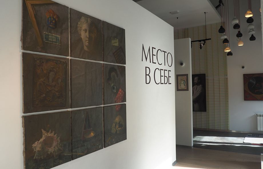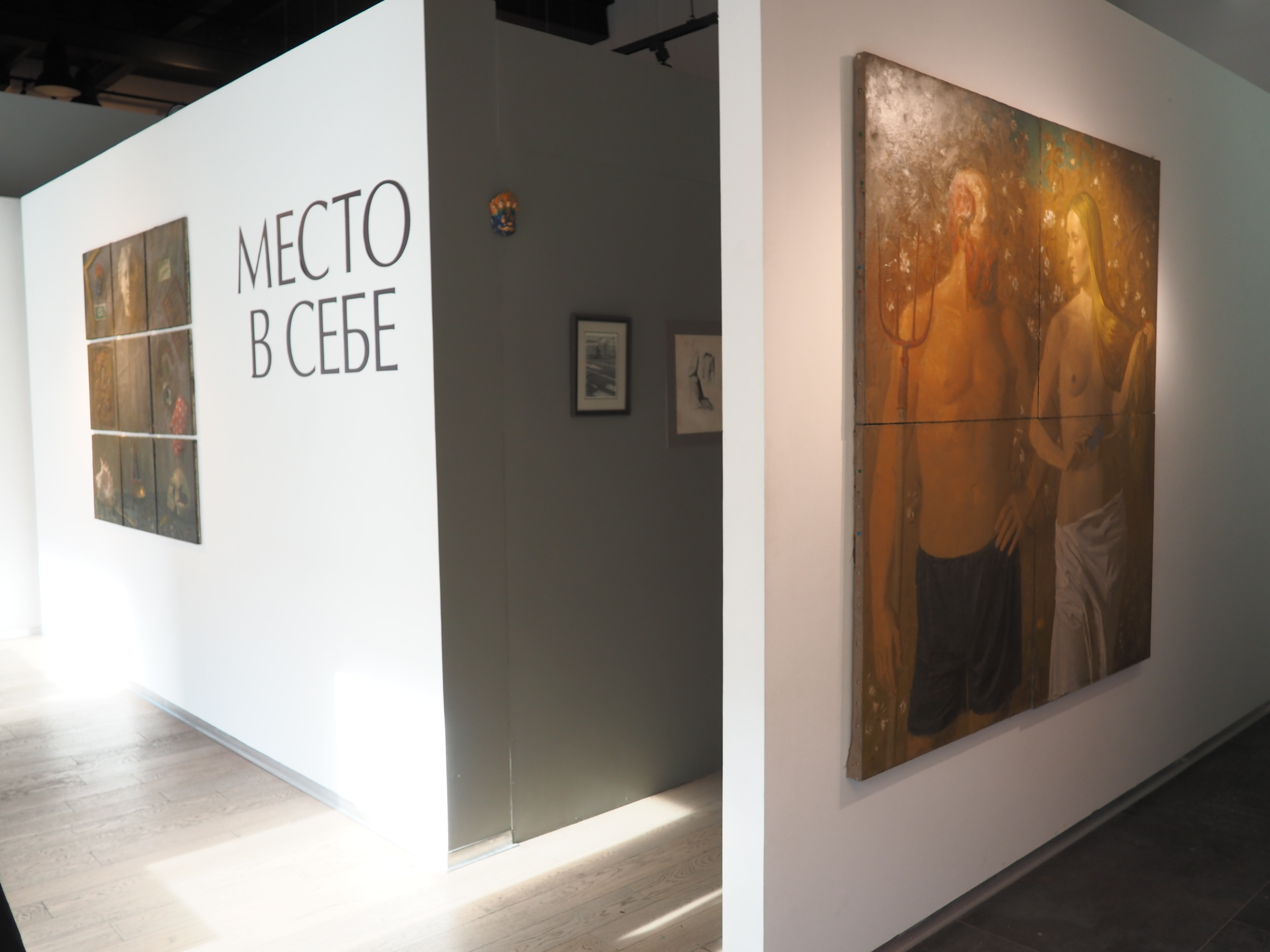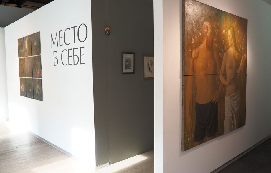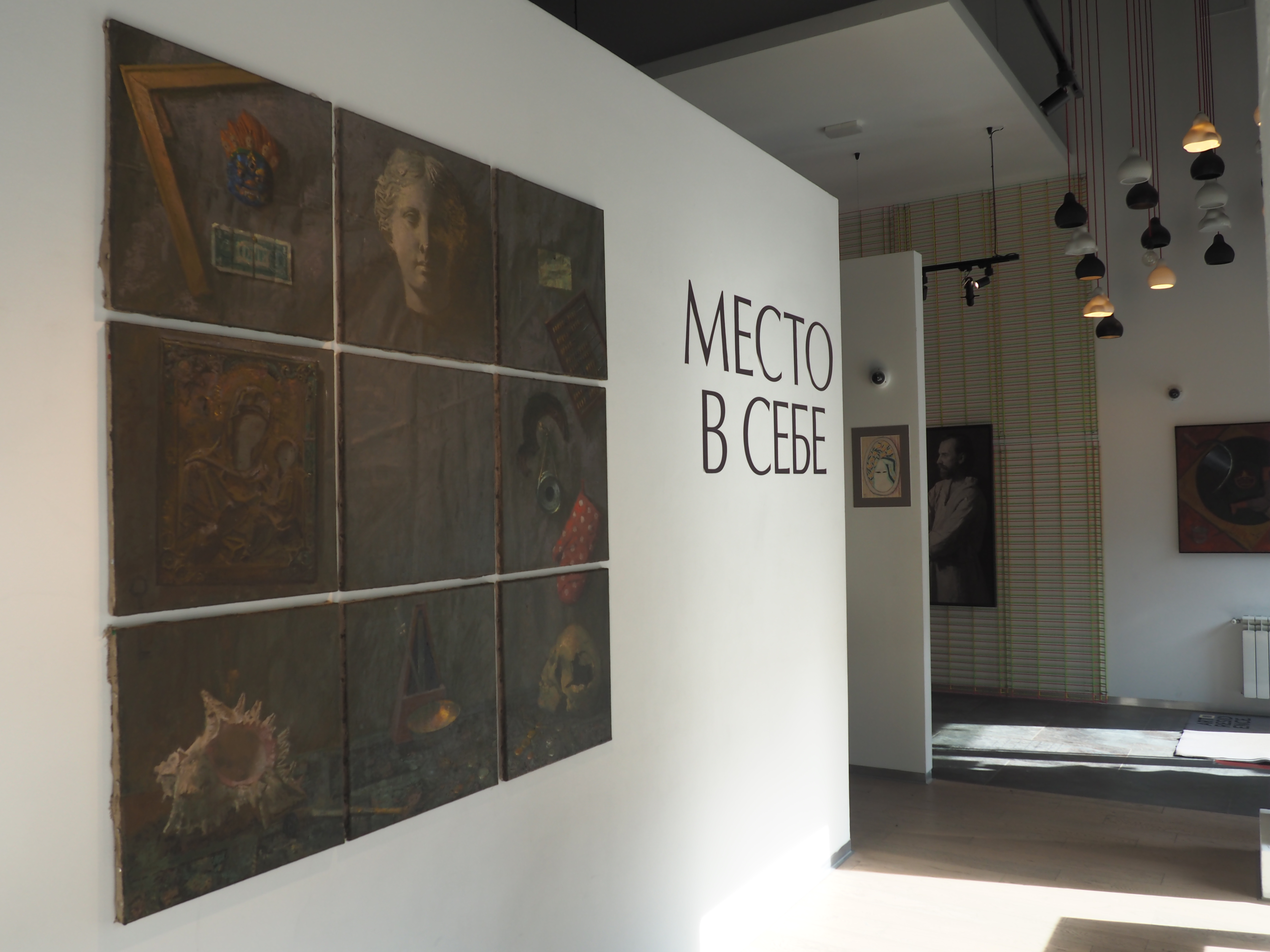 «Выставка-инсталляция “Место в себе” приглашает зрителя в увлекательное путешествие. Она постарается перенести нас во времени на тридцать лет назад. Но в то же время это путешествие внутри собственного сознания. Поэтому мы просим вас пристегнуться и занять место в себе. Полет начнется с темноты коридора и свиста проносящихся мимо вещей», – арт-группа «Россия». Иммерсивное погружение начинается с обычных и не очень объектов на стенах и полках в выстроенной мастерской, в различных сочетаниях проявляющихся и на картинах. Зрителю предстоит перенестись в атмосферу мастерской девяностых годов, где будто зашифрованы ключи к пониманию целого живописного направления, целого мира символов и целой эпохи с 1990 по 2005 год.
