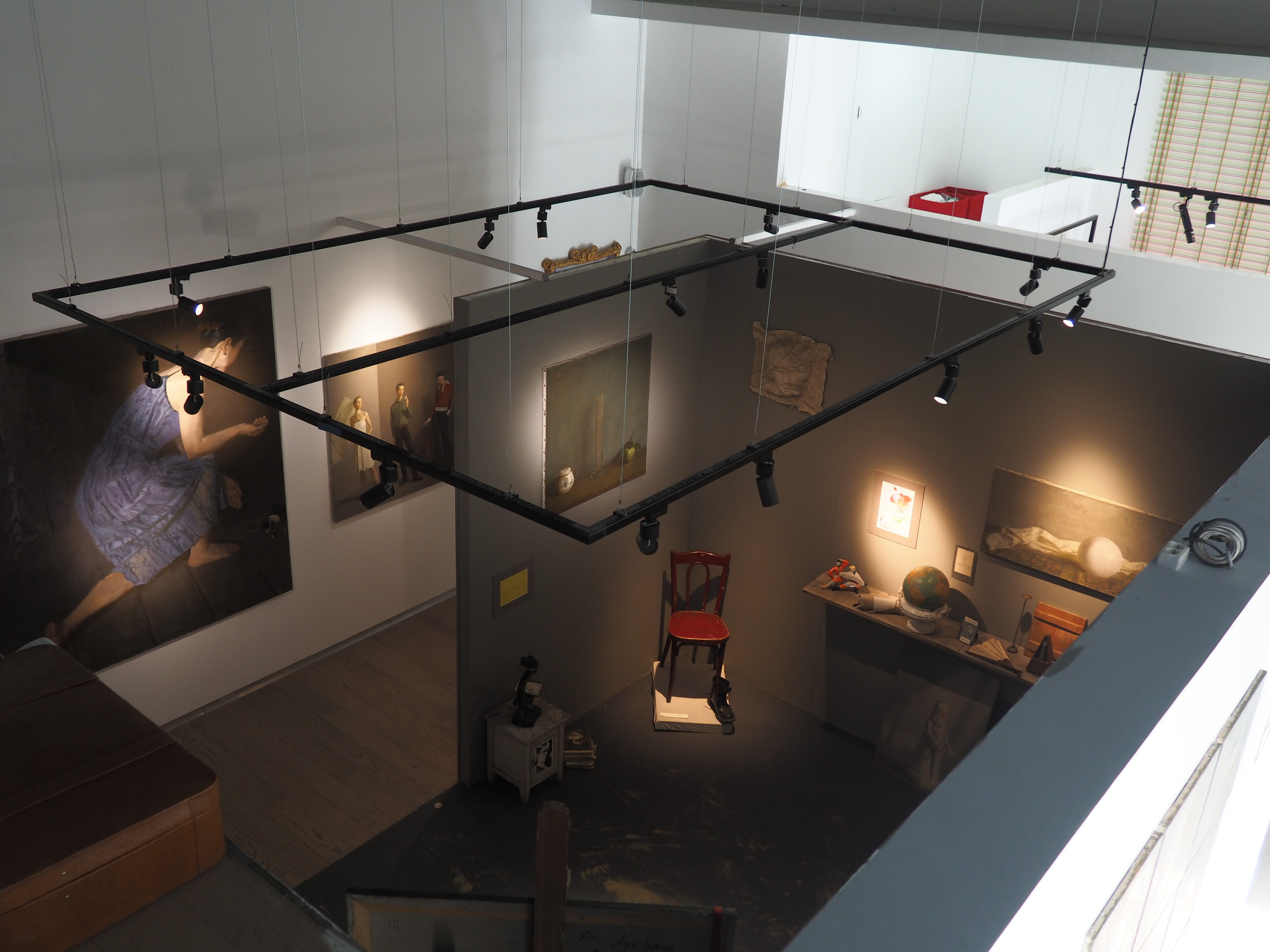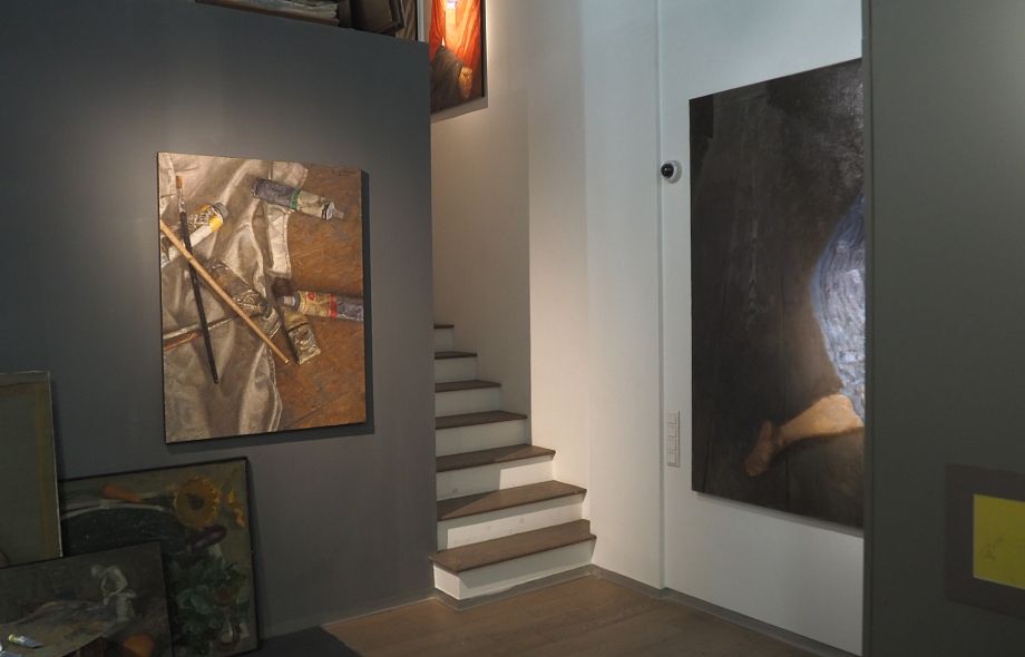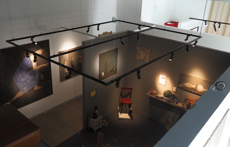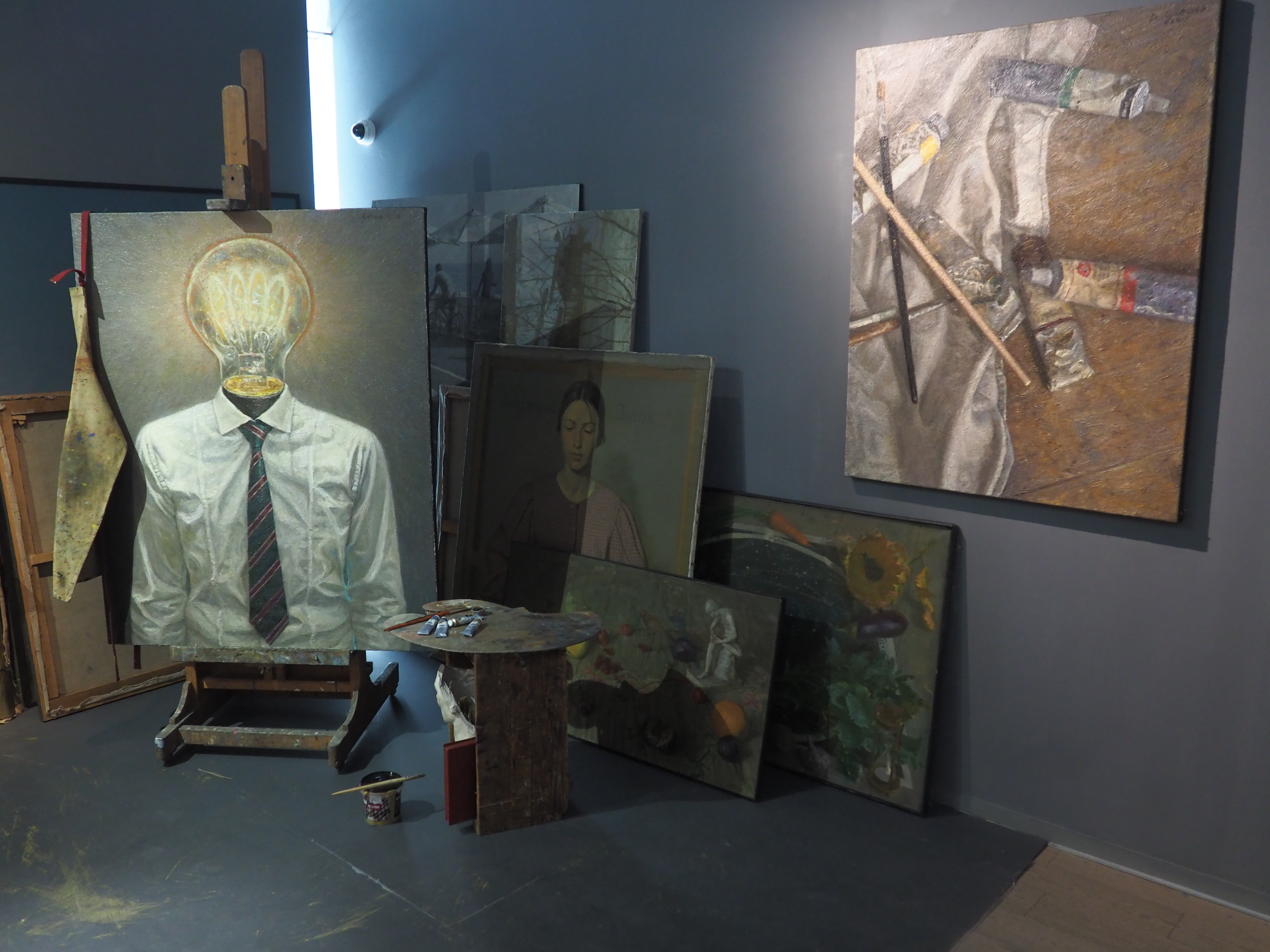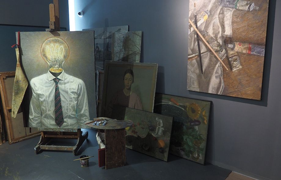 Живописные холсты отвернуты к стенам, перевернуты «вверх ногами», в случайном порядке накладываются один на другой, создавая тем самым новые сюжеты. Отдельные произведения, разумеется, видны целиком — на стенах «мастерской» и на рабочем мольберте. В экспозиции также расположены забытые вещи и подаренные произведения Павла Пепперштейна, Сергея Ануфриева, Аркадия Насонова, Сергея Балашова, Евгения Кемеровского, Евгения Нестерова, Николая Колупаева и других.