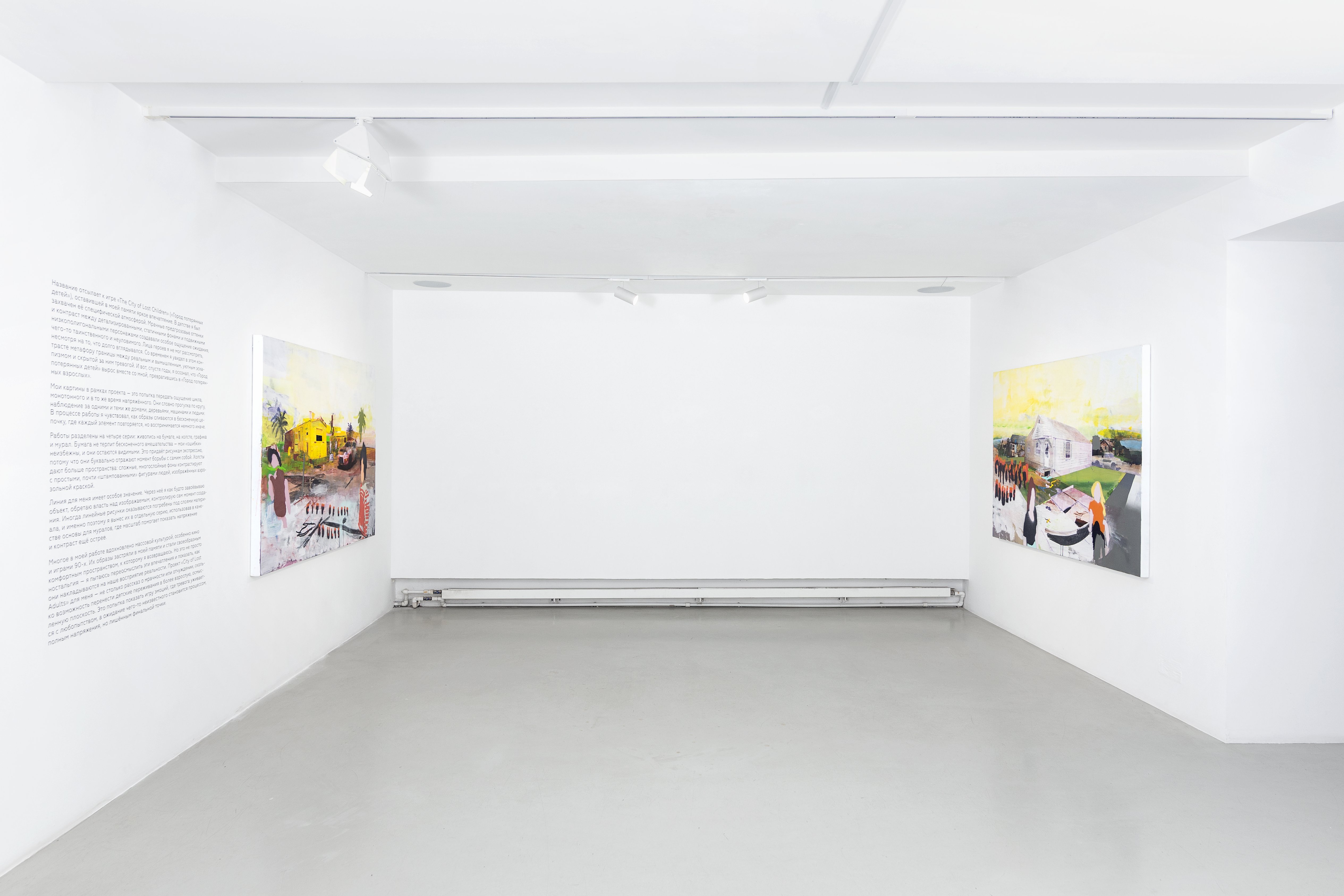 «И вот, спустя годы, я осознал, что этот “Город потерянных детей” вырос вместе со мной, превратившись в “Город потерянных взрослых”», — рассказывает Михаил Левиус. Работы переносят зрителя в бесконечную прогулку по замкнутому миру, где одинаковые дома, деревья и фигуры людей словно повторяются, но каждый раз открываются немного иначе.