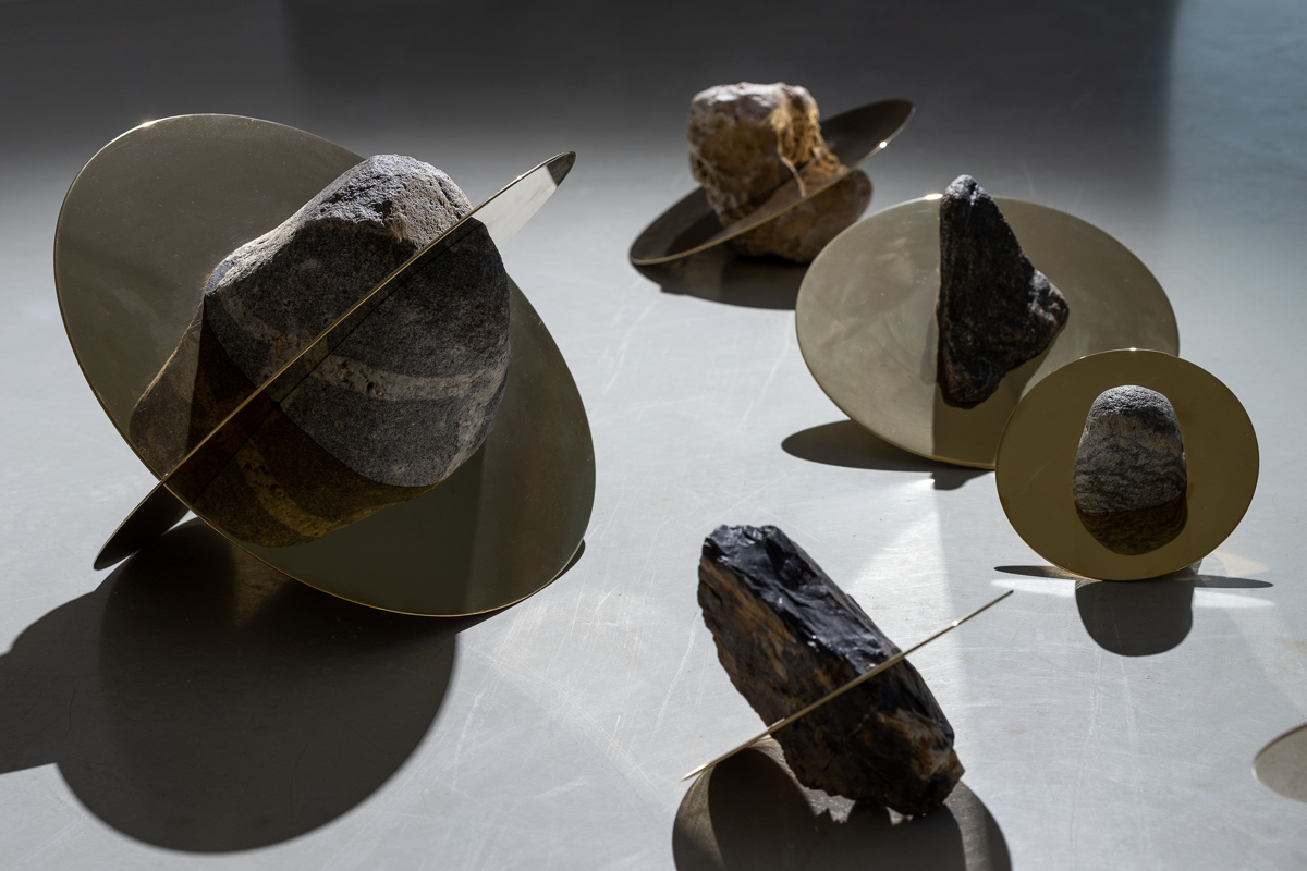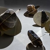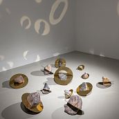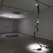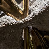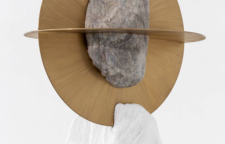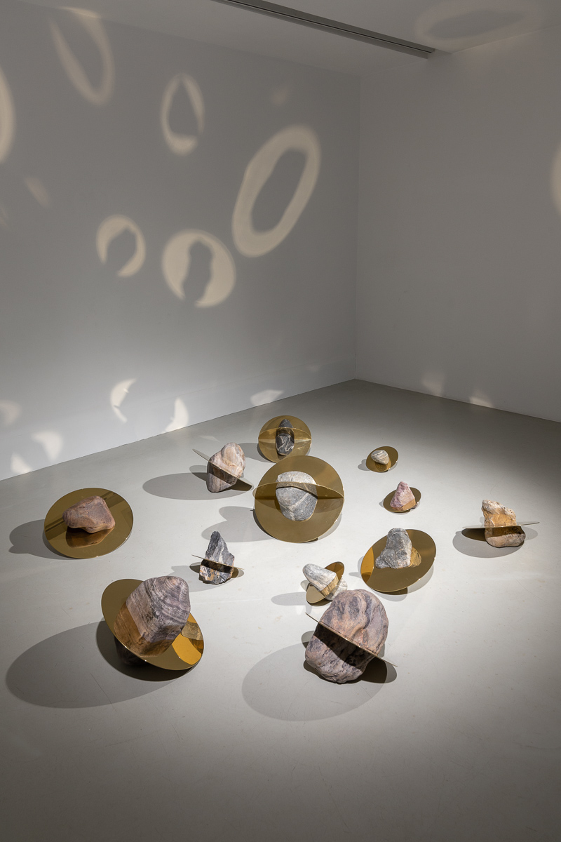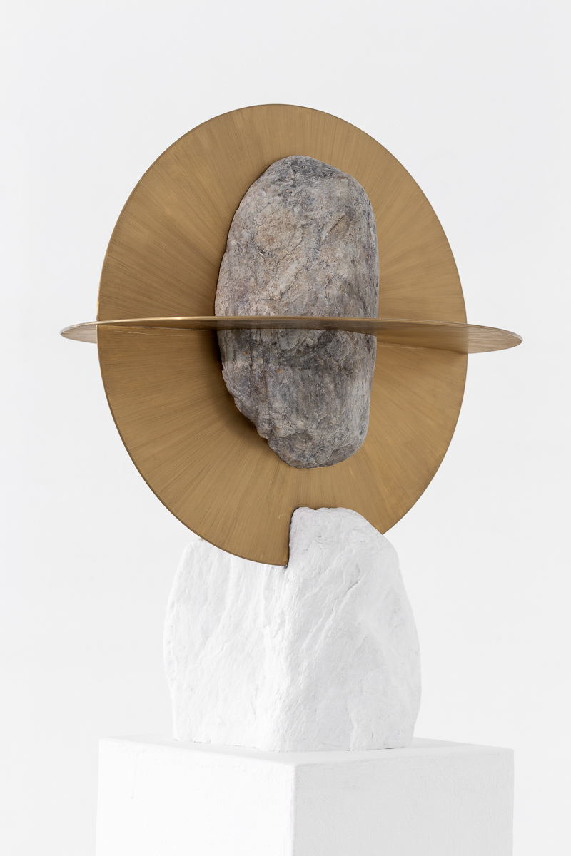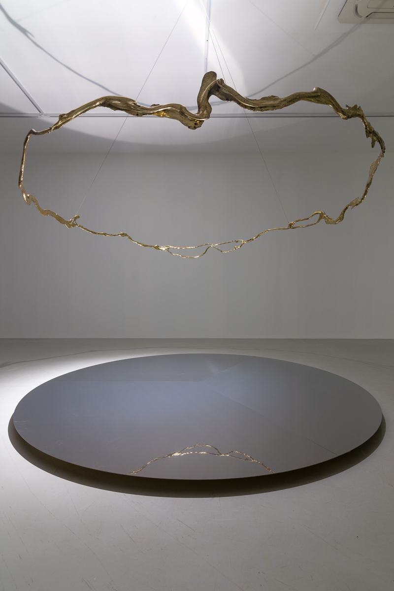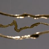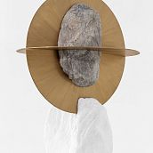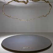 На этом же диалоге с пространством построена и другая работа, где тот же стремительный поток бегущего ручья разомкнут и взвинчен подобно гигантскому воздушному змею. Он продет сквозь камень и прошит лучом копья. Это сопряжение разных типов форм знаменует выраженное здесь символическое начало. Золотые круги, отлитые в форме диска, также взаимодействуют с дикими камнями в серии скульптур, рассекая их пополам и крест-накрест.