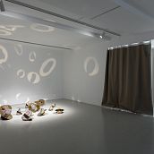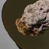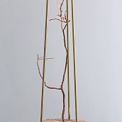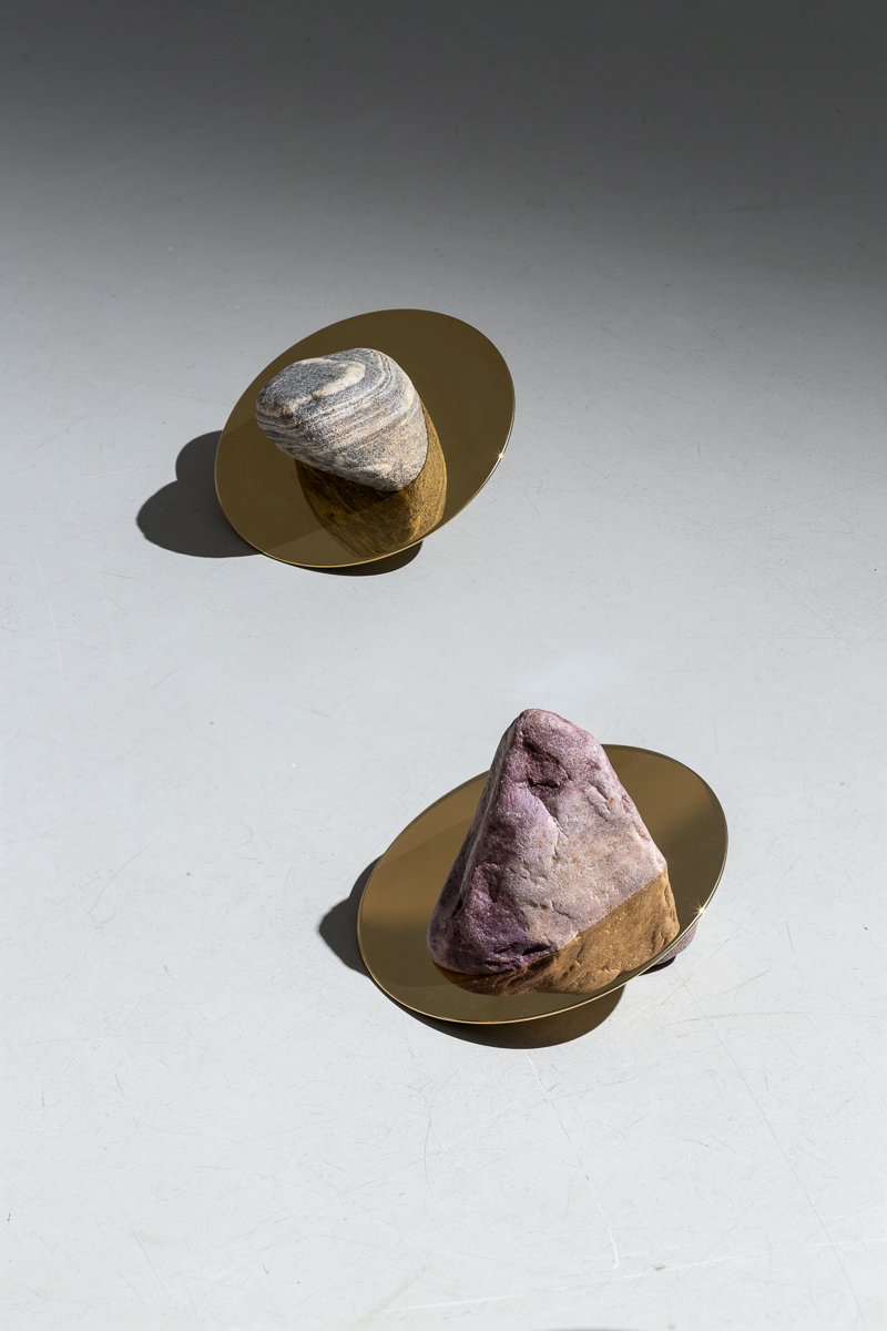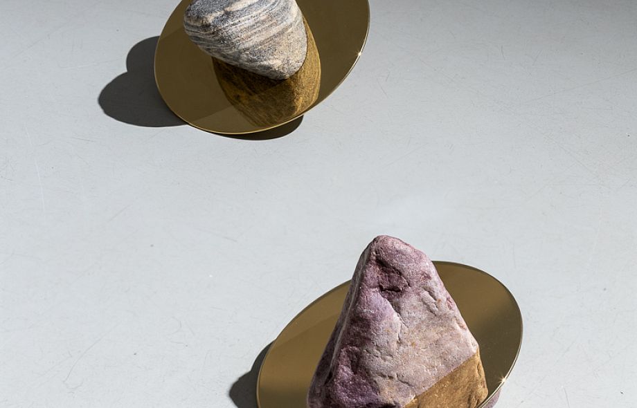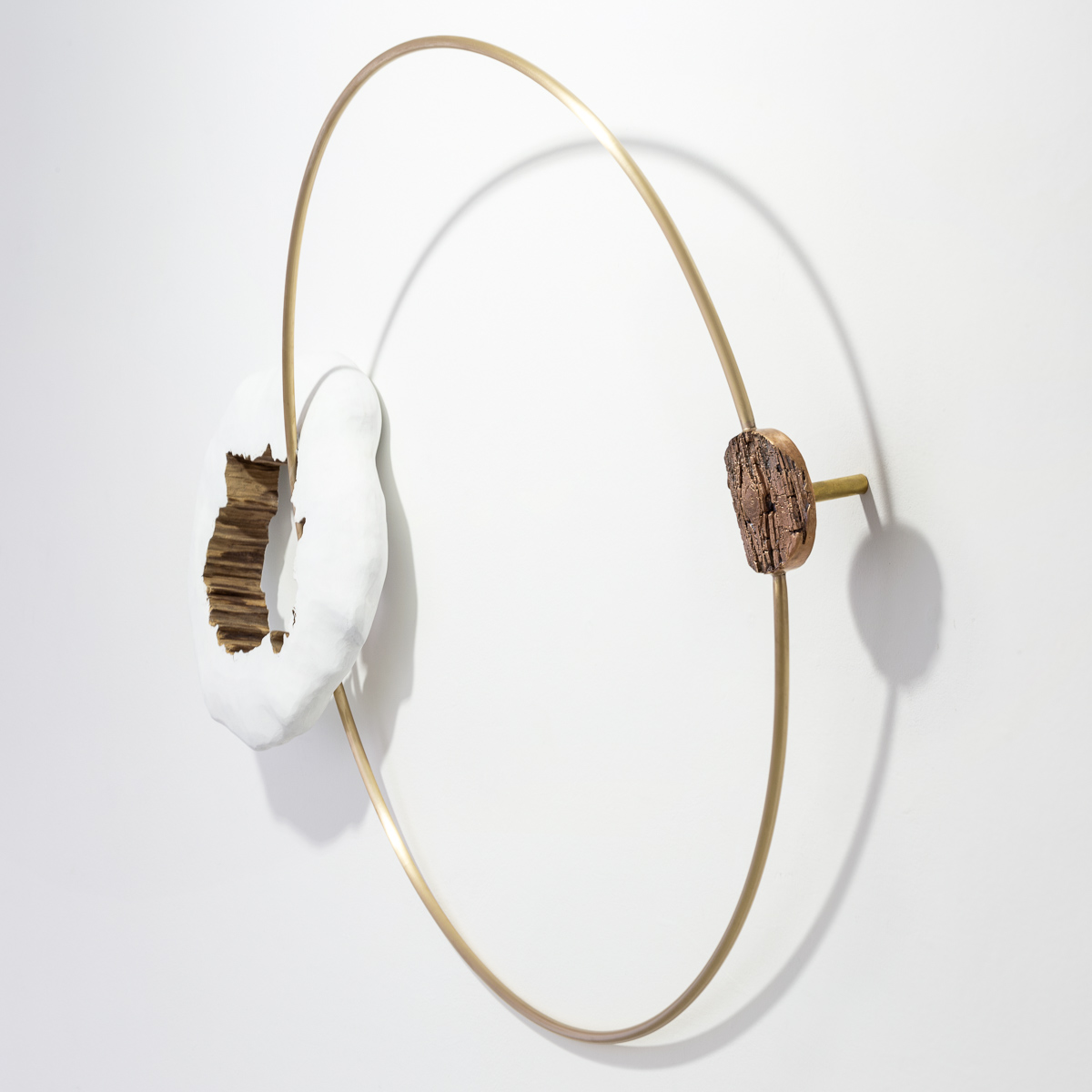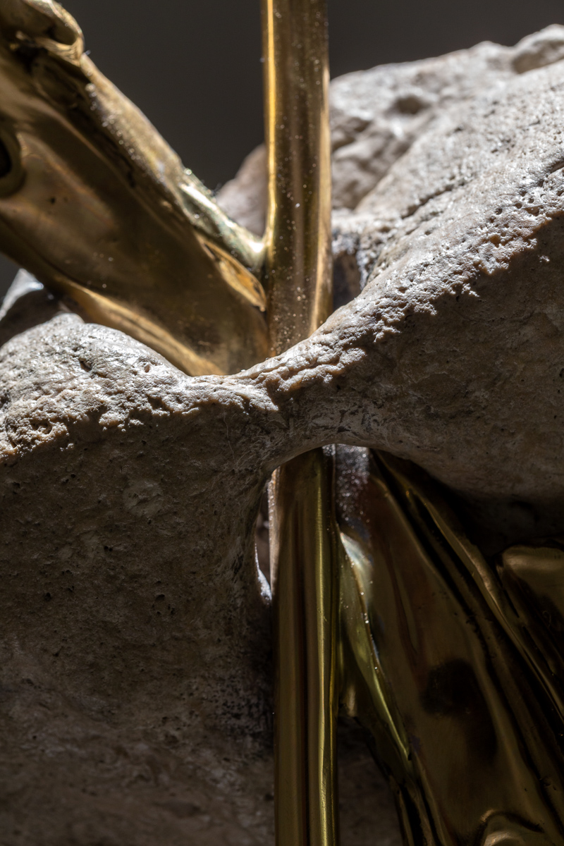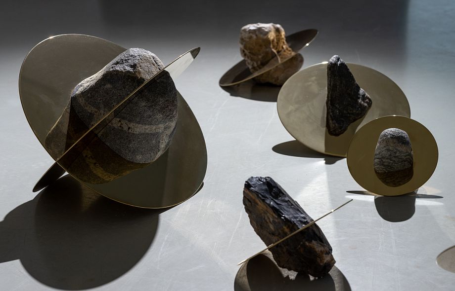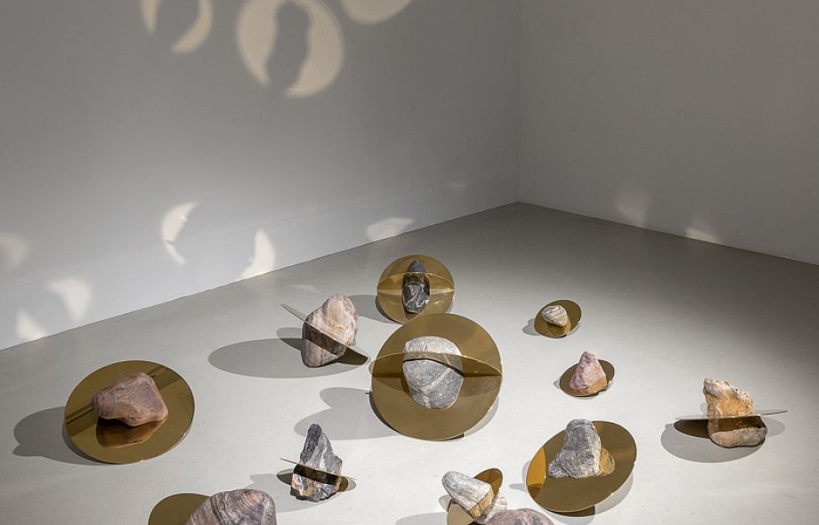 На этом же диалоге с пространством построена и другая работа, где тот же стремительный поток бегущего ручья разомкнут и взвинчен подобно гигантскому воздушному змею. Он продет сквозь камень и прошит лучом копья. Это сопряжение разных типов форм знаменует выраженное здесь символическое начало. Золотые круги, отлитые в форме диска, также взаимодействуют с дикими камнями в серии скульптур, рассекая их пополам и крест-накрест.