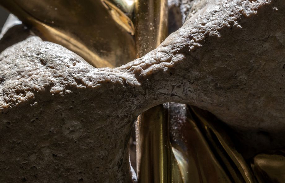 Живое творящее начало формы присутствует и в сверкающем сгустке литого потока, прошивающего веер из трех плоскостей — так страницы книги соединяют золото мысли, изложенной в ней. Художник позволяет форме сложиться органично и естественно, прислушиваясь к ее появлению в мире, где в капле воды уже живет вселенная. Лучик света из крохотного отверстия в стене оказывается оком в таинство рождения жизни — в глазок мы видим море, в волнах которого купающийся мальчик приближается к нам и выходит на берег.